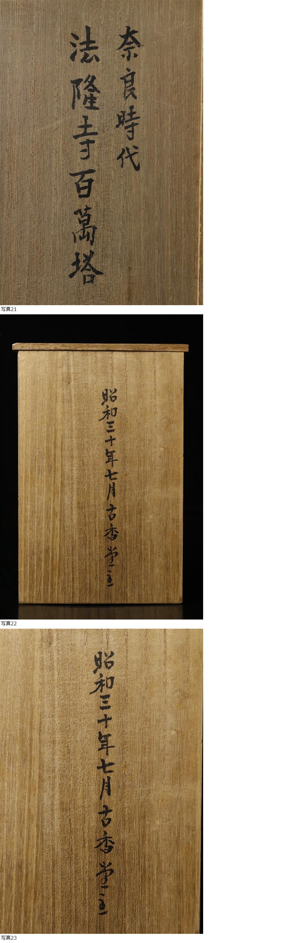 260227F01* * * 商品詳細 * * * ここでしか出逢うことのできない唯一の美をご紹介させて頂きます。 歴史の風格を携えた法隆寺百万塔のご紹介です。 奈良時代、称徳天皇の祈願により100万基が制作された 世界最古の印刷物 陀羅尼経を納めるための百万塔。 本品は歴史を感じさせる木肌の質感が素晴らしく、 骨董としての深い味わいを纏っており、 内部には当時の信仰を今に伝える陀羅尼経が納められております。 小さくも神聖で強い存在感のある百万塔を、 この機会に是非お手元にてご堪能下さい。 ■商品内容/百万塔、陀羅尼経、箱 ■サイズ/横10.5cm×高21cm 箱:横15cm×高22.7cm×奥行16㎝ ■状態/スレ、傷、欠け、割れ、直し、欠損、経年による傷み、 陀羅尼経に焼け、折れがございます。 ※写真にてご確認、ご了承の上ご入札下さい。 * * * 支払詳細 * * * !かんたん決済 * * * 発送詳細 * * * 入金確認後3営業日以内に発送致します。 ※直接引き取りも可能です。 60~160サイズにつきましては 佐川急便、ゆうパックのどちらかで発送いたします。 ゆうパック発送の場合、弊社の発送日から追跡サービスに問合せ番号が反映されるまで 約1日ほどお時間がかかりますのでご了承下さい。 * * * 注意事項 * * * 運送中の破損があった場合は速やかに当社までご連絡下さい。 保険を利用するのに受取連絡後に運送会社による現場での破損状況確認が必要となります。 勝手に返送されますと保険の適用外となりますのでご注意ください。 * * * * * * お問い合わせ:082-236-8669 |