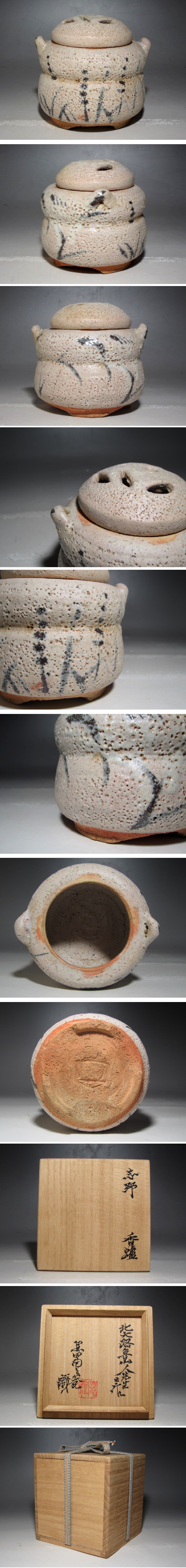 北大路魯山人作の志野香炉です。 趣のある見事な出来栄えの逸品です。 箱蓋裏に二代黒田陶々庵の極めがあります。 【北大路魯山人(きたおおじろさんじん)1883-1959】 陶芸家。京都上賀茂出身。 近代美術史の中でも異色の芸術家で、篆刻家・画家・陶芸家・書道家・漆芸家・料理家・美食家などの様々な顔を持っている。 大正期に「美食倶楽部」「星岡茶寮」を創業し、使用するすべての食器を創案製作。以後ひたすら陶芸に没頭する。 織部焼の重要無形文化財保持者(人間国宝)に指定されるも辞退。 サイズ 直径10.5cm/高さ10cm(多少の誤差はお許しください) 状態 一見して疵やヒビ・直しは見られません。 骨董品という事をご勘案頂き、時代経過のスレや、小さな傷がある場合があるかもしれませんのでご承知置きください。 | |||