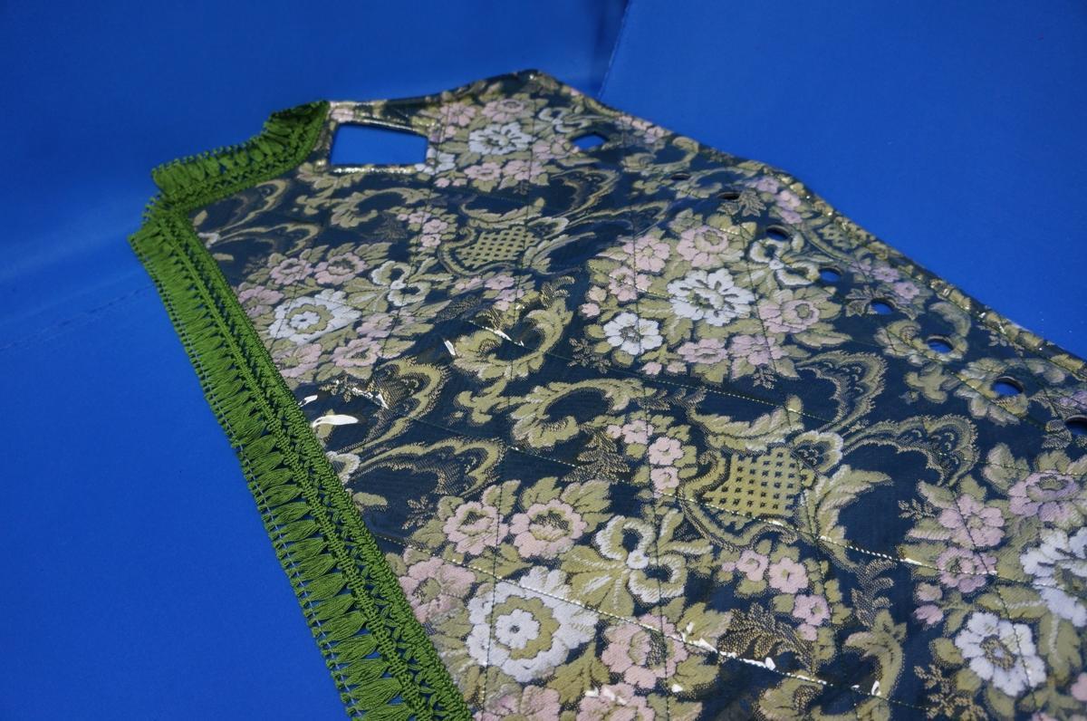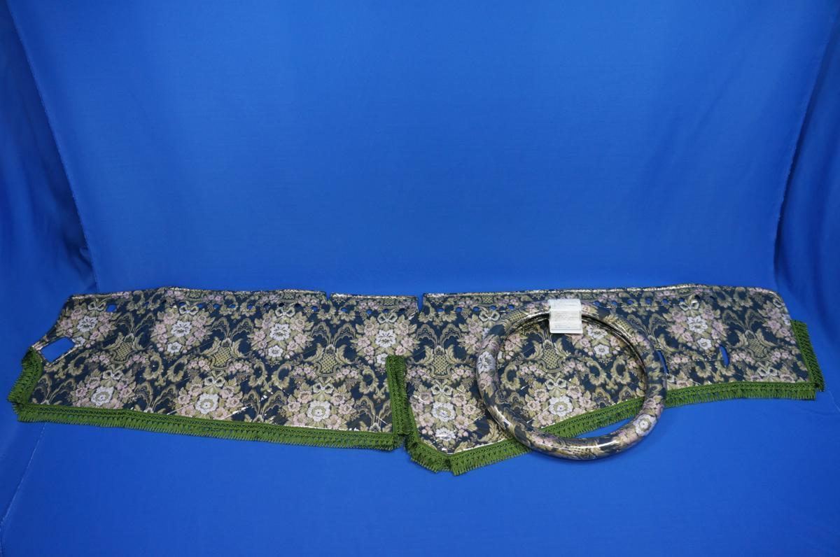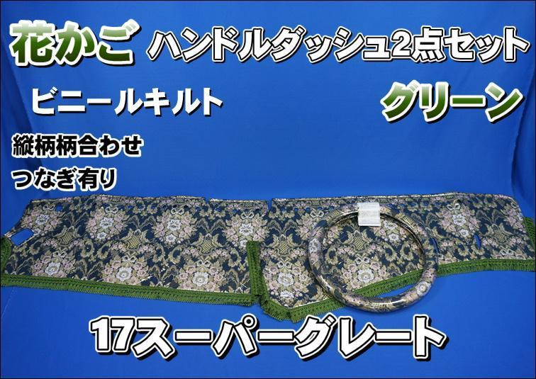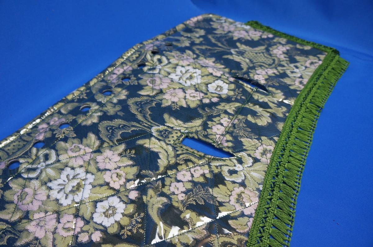 | 商品紹介 | ■ダッシュマット(ビニールキルト付き) ※5000円アップでリング付き(ゴールド/シルバーリング)に変更可能です。 ご希望の方は、ご注文後お知らせください。 ■エアコン吹き出し口:丸穴仕様 ■極太ハンドルカバー(ビニール付き) ■柄:花かご(縦柄・つなぎ有り) ■色:グリーン ※ワインもございますので、お問い合わせください! ※同色の生地フロアマット等も製作可能です。お問い合わせ下さい! |