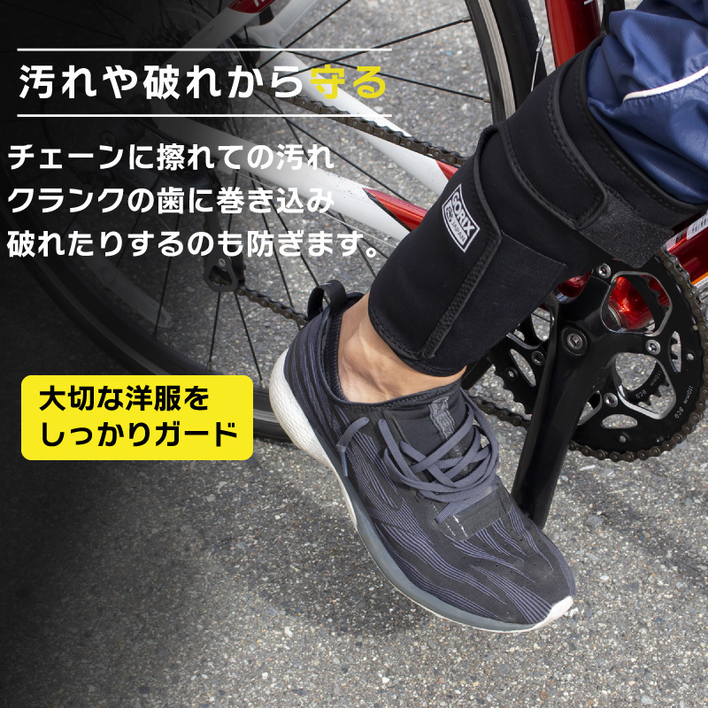 チェーンやクランクに擦れてズボンが汚れたり、クランクに巻き込まれズボンが破けたりするのを防止します。