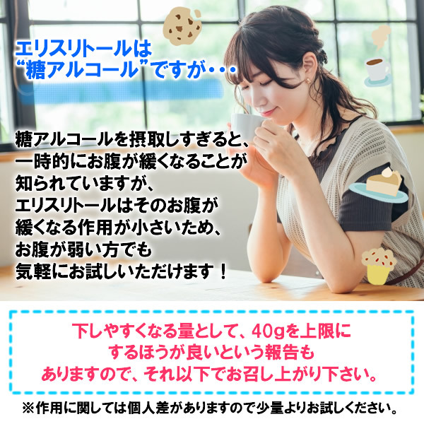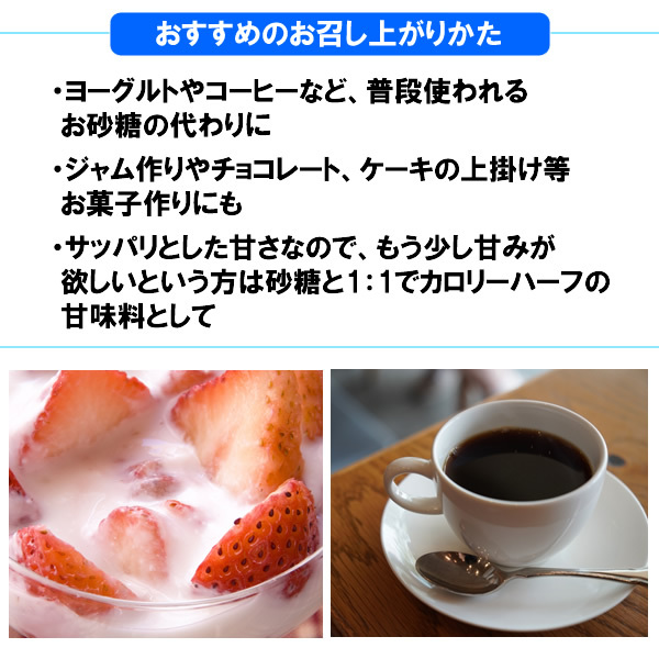 | ヨーグルト、コーヒー、紅茶などに、お砂糖の代わりに入れてお使いください。 製菓やお料理にもご利用いただけます。 糖アルコールを摂取しすぎると一時的にお腹が緩くなることが知られていますが、エリスリトールはそのお腹が緩くなる作用が小さいため、JECFA(FAO/WHO合同食品添加物専門委員会)により、“エリスリトールは「ADI(一日摂取許容量)を特定しない」”という結論が出され、極めて安全性の高い物質であることが認められています。 ですがそういった安全性とは別に、下しやすくなる量として40gを上限にする方が良いという報告もありますので、それ以下でお召し上がり下さい。 ※本品は医薬品や特定保健用食品ではございませんので、個人差があります。 ごく稀に、エリスリトールが結晶化して形成された真っ白の固体や、橙色・茶色の粒が混ざっている事がありますが、品質には問題ございませんのでご了承ください。 | ||||||||||