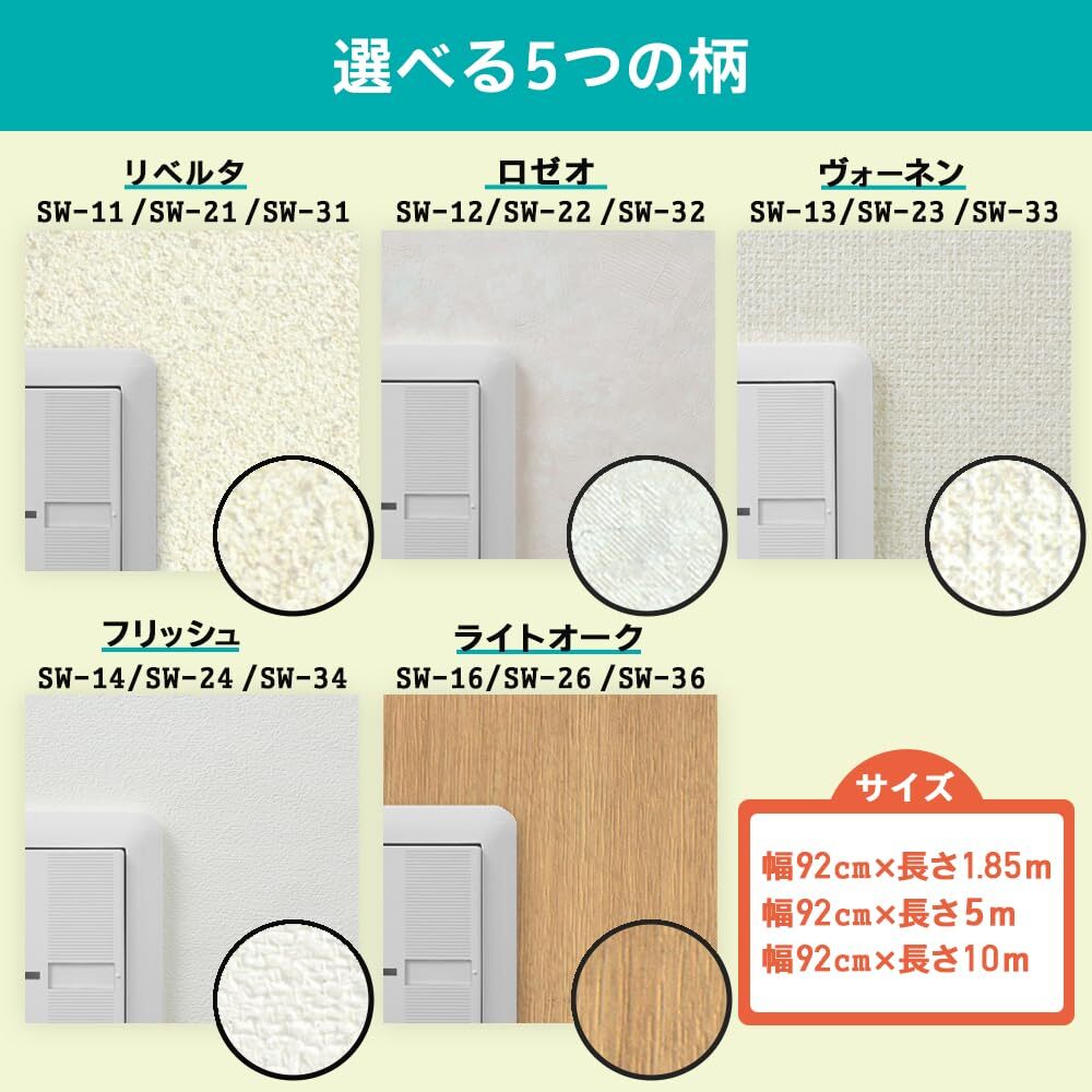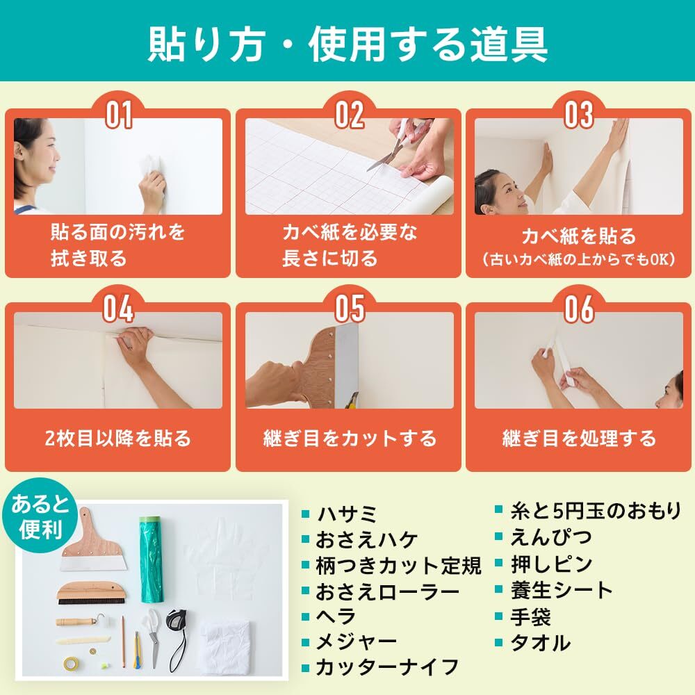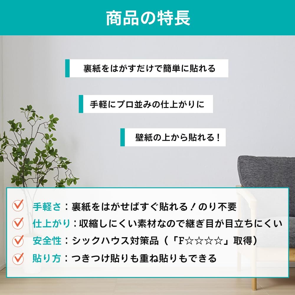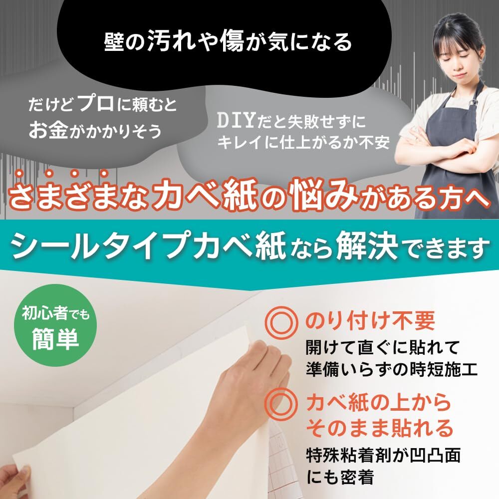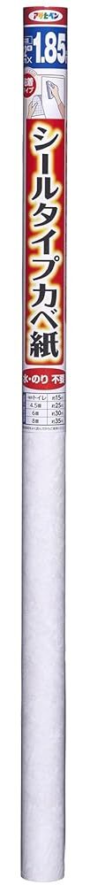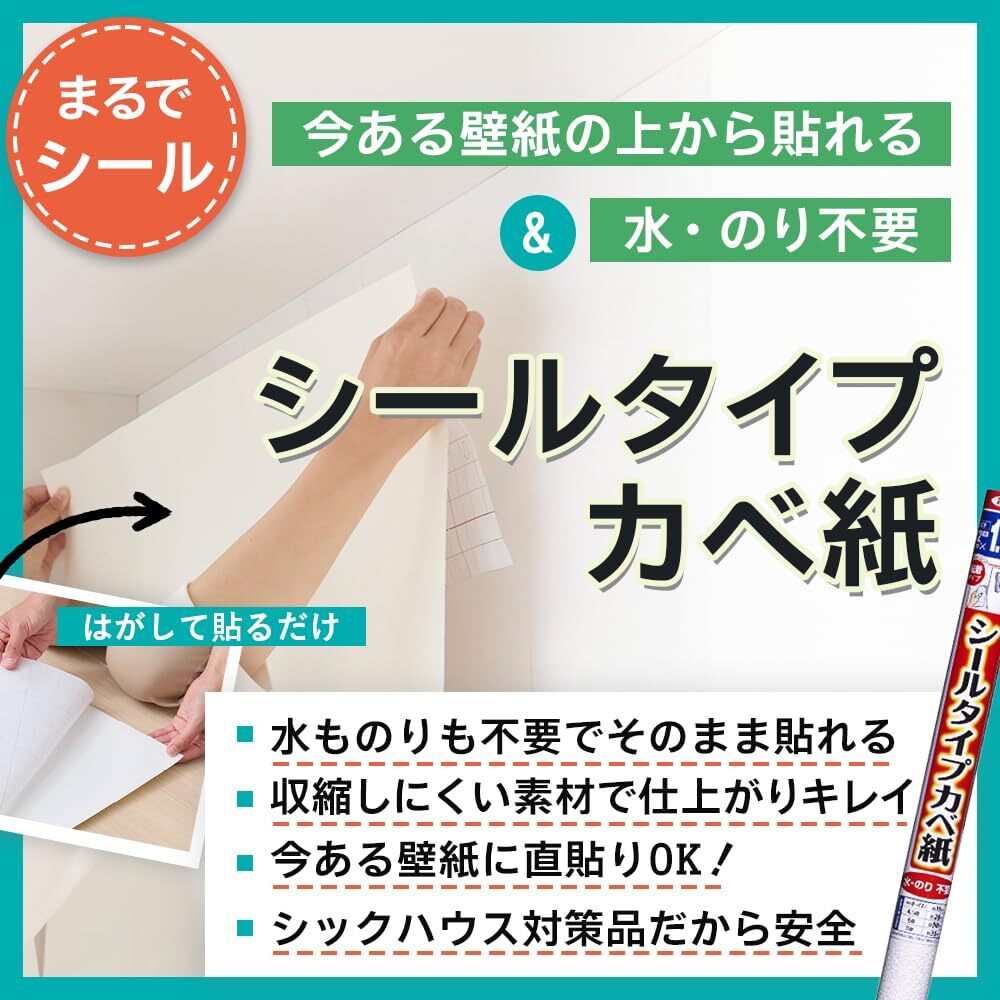 「商品情報」幅92cm×長さ1.85m ●裏紙をはがすだけで簡単に貼れます。●今、貼ってあるカベ紙の上に、直接貼ることができます。●カベ紙の基材に寸法安定性の良いPETシートを使用しているので、ジョイント部分の目開きがほとんどありません。●特殊粘着剤が古いカベ紙の凹凸面にもしっかりと密着します。●つきつけ貼りや重ね貼りのような手軽な貼り方もできます。【用途】●カベ紙貼り用。【貼れる面】●ビニルカベ紙*、紙カベ紙、ベニヤ板、化粧合板、シックイ壁、ツヤあり塗装面、ツヤ消し塗装面。【貼れない面】●布カベ紙、砂壁、せんい壁、天井、浴室内などの水のかかる場所、レンジまわりなどの火気のある壁面、屋外。※表面がザラザラした一部の砂壁調のビニルカベ紙や、セロハンテープが接着しないような特殊な表面加工されたカベ紙には、充分接着しないことがあります。「主な仕様」シールタイプ(粘着タイプ)なので、のり付け作業がいらず、裏紙をはがすだけですぐに貼れます。カベ紙の基材に寸法安定性の良いPETシートを使用しているので、つなぎ目部分の目開きがほとんどありません。