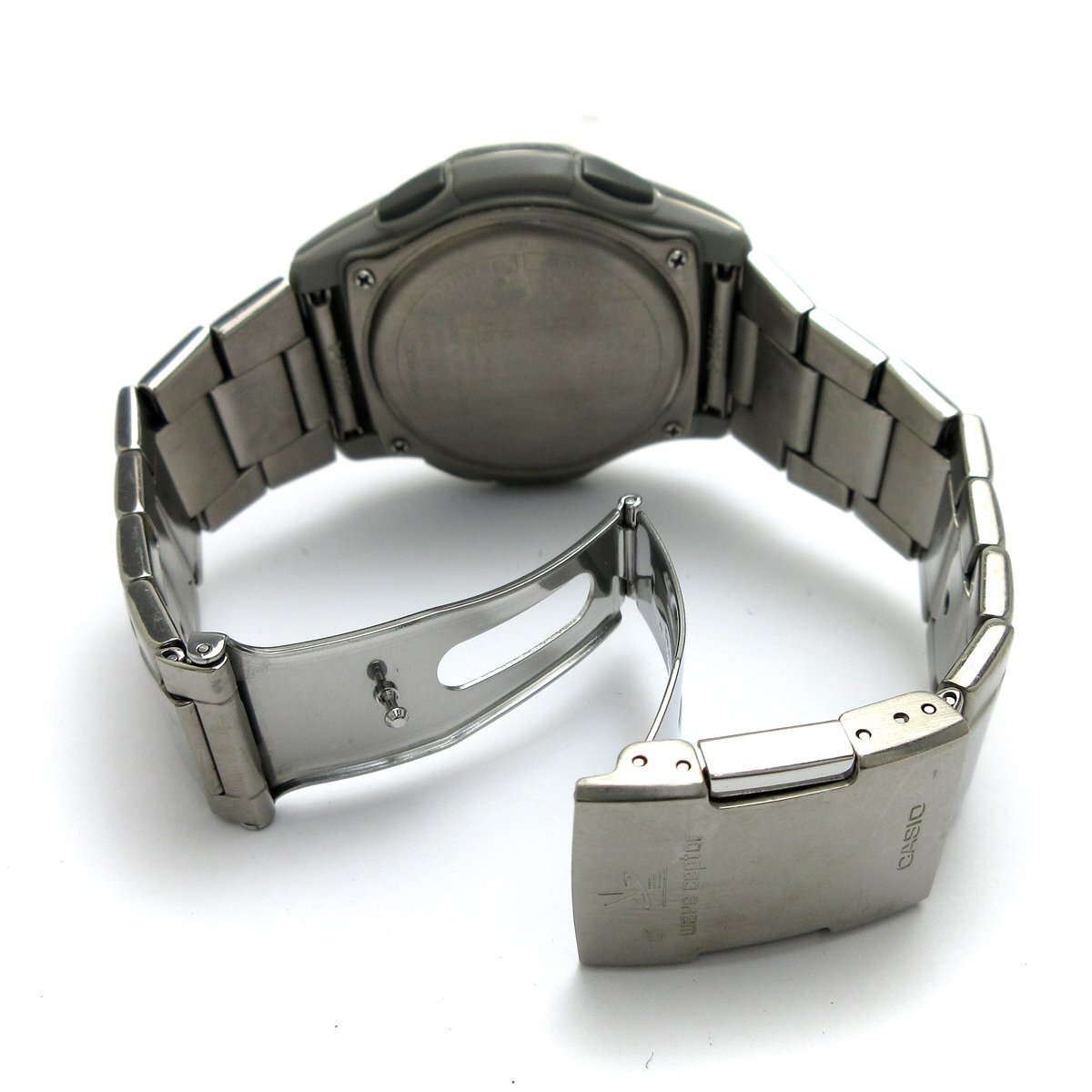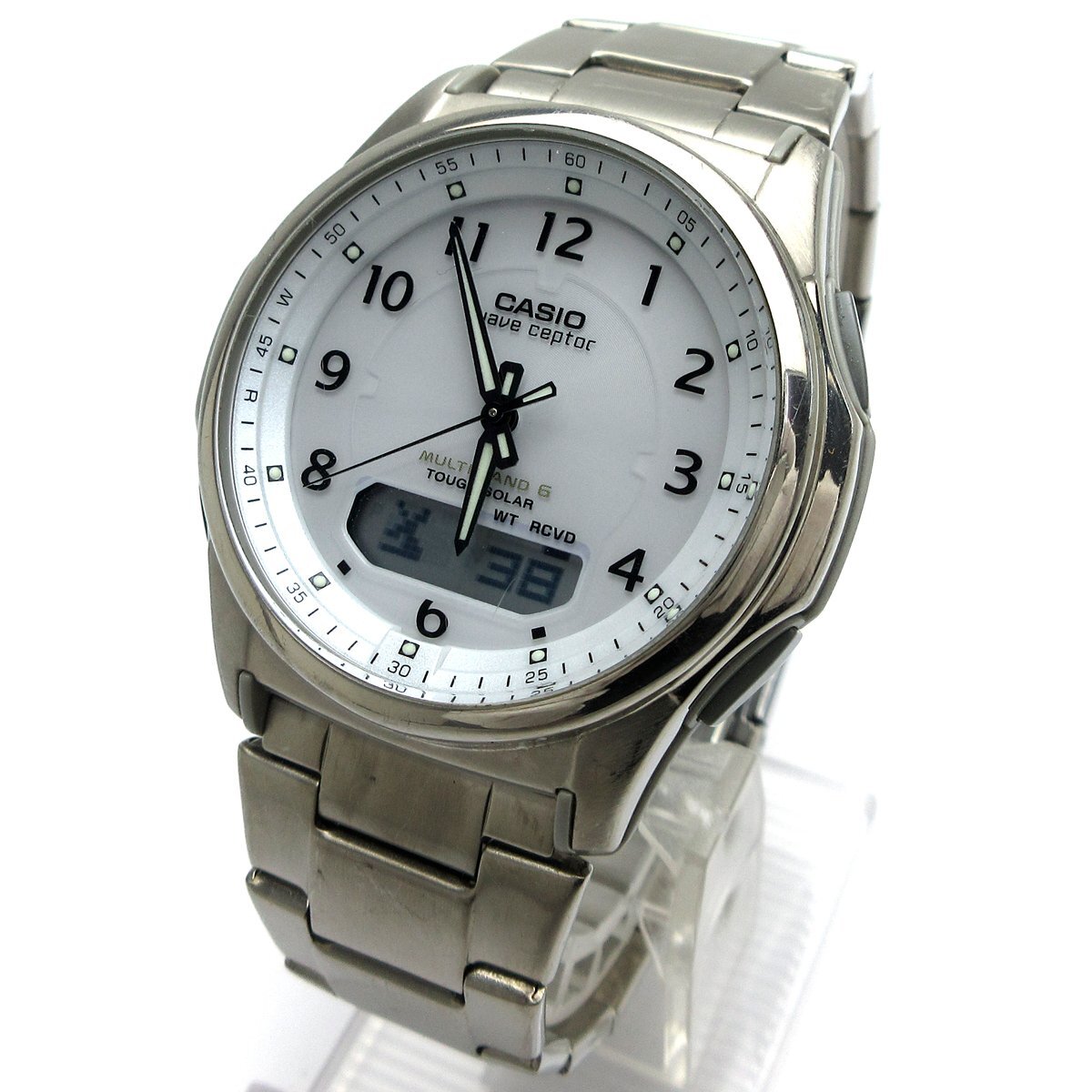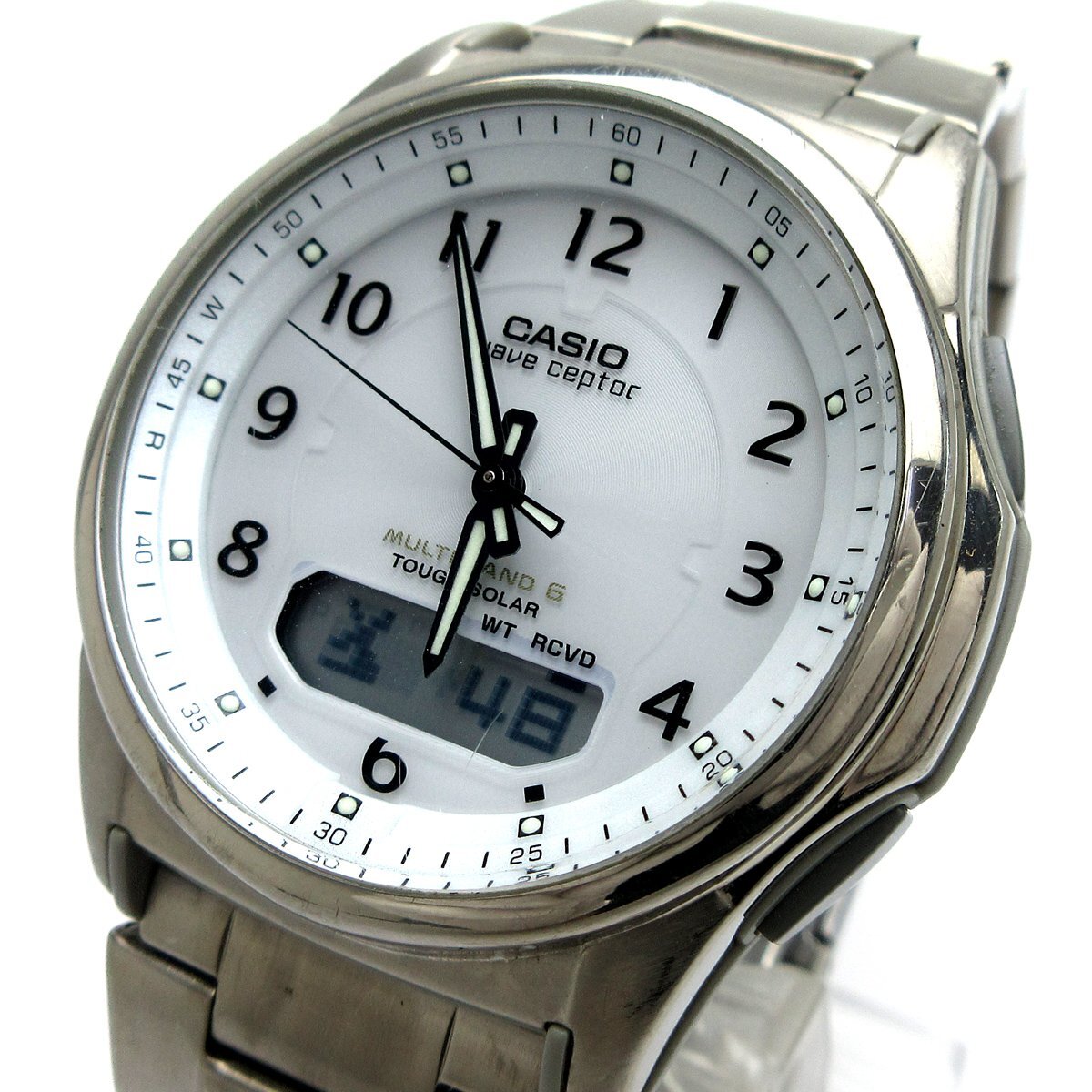 ■『ソーラーコンビネーション』。 ■ホワイトダイアルにデジタルとアナログ針を装備したモデル。 ■シンプルなデザインに多機能搭載で日常使いからお仕事など幅広く使える時計です。 ◎ソーラー充電、電波受信。 ◎タイマー、アラーム。 ◎ワールドタイム。 ◎ストップウォッチ。 ◎ライト。 ◎カレンダー。 ◎WプッシュボタンつきDバックル。 ---【商品状態】--- ☆外装、クリーニング済、スリキズはありますが比較的キレイです。 ☆ガラスに小キズがありますが肉眼では分かりにくく、視認性に影響はありません。 ☆ブレスサイズはコマ調整にて短くする事ができます。 ☆中古商品のため防水性の保障はつきませんのでご了承下さい。 ※商品画像はお客様のモニター環境によっては色調が異なって見える場合がございますのでご了承ください。 |