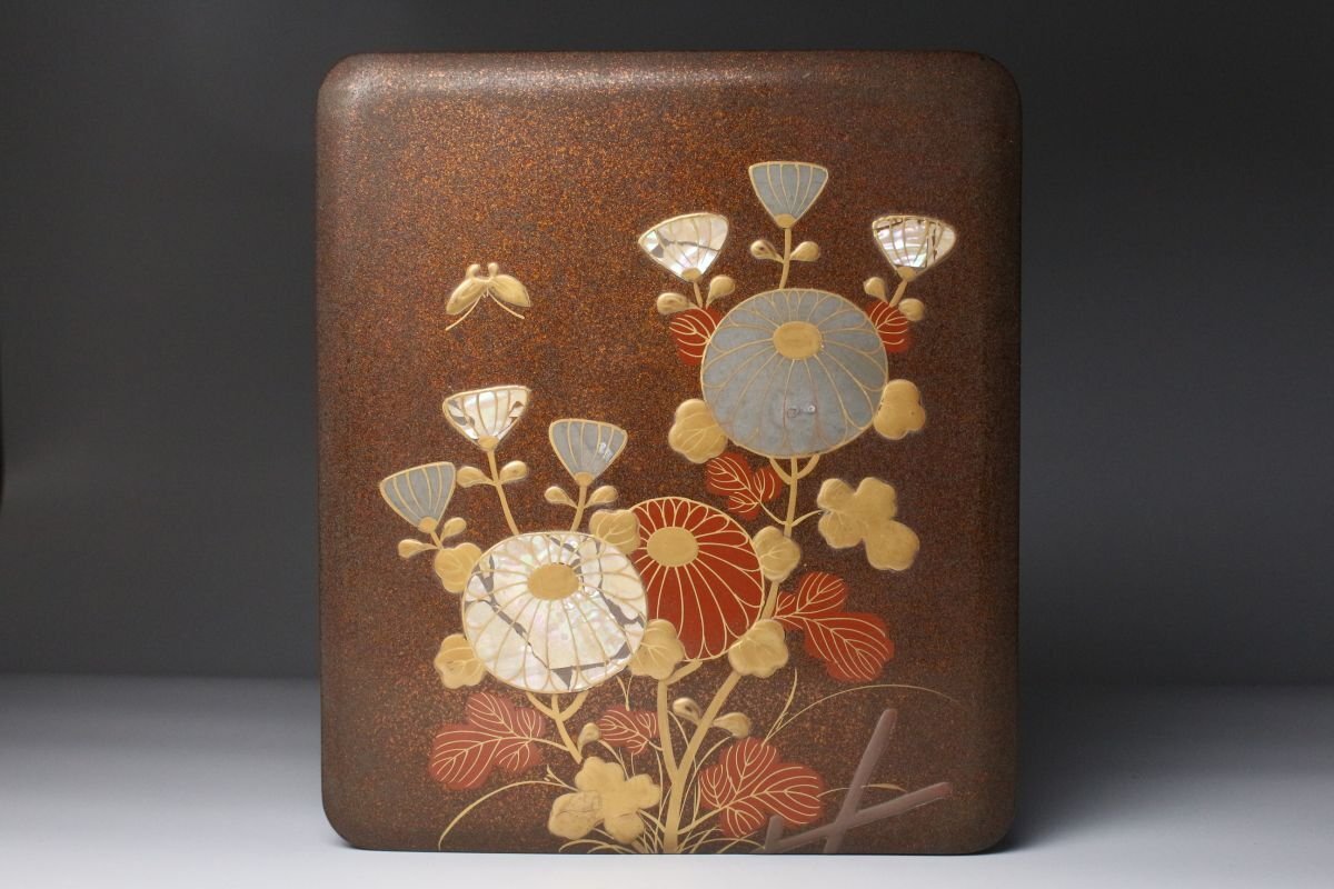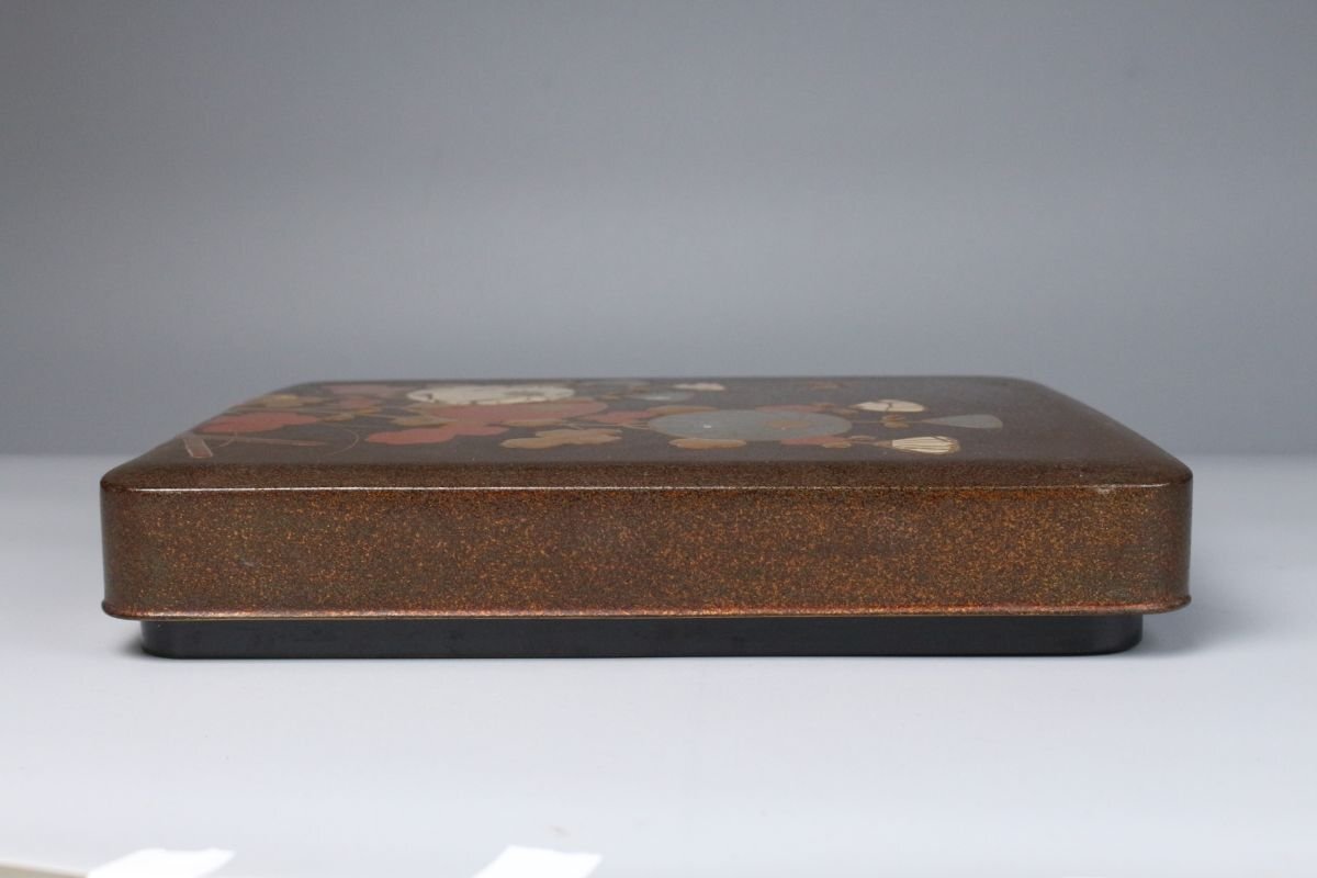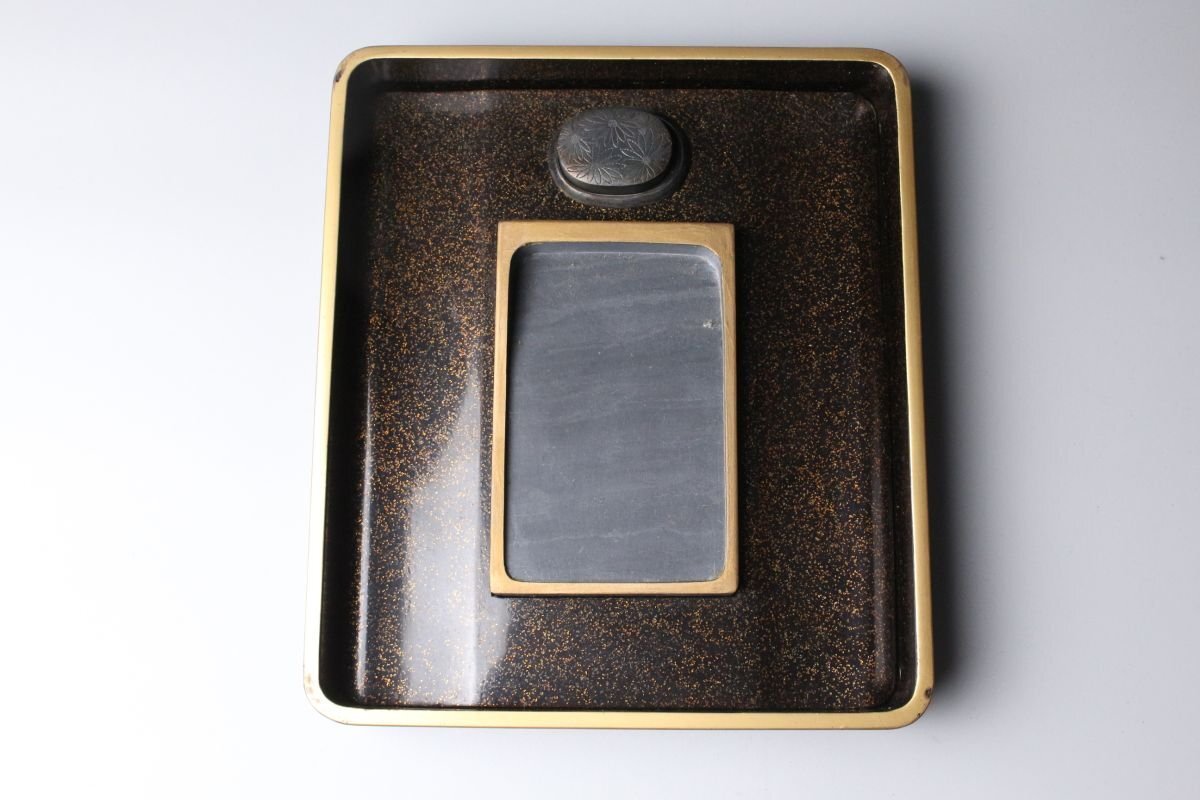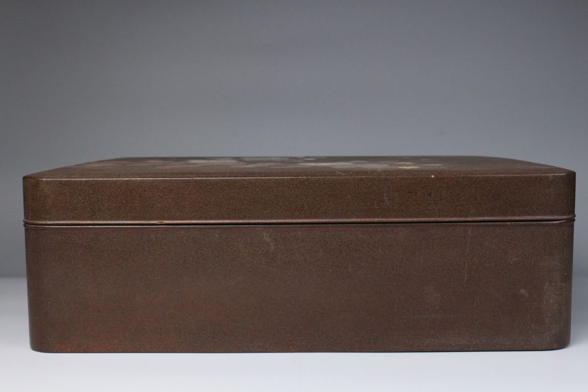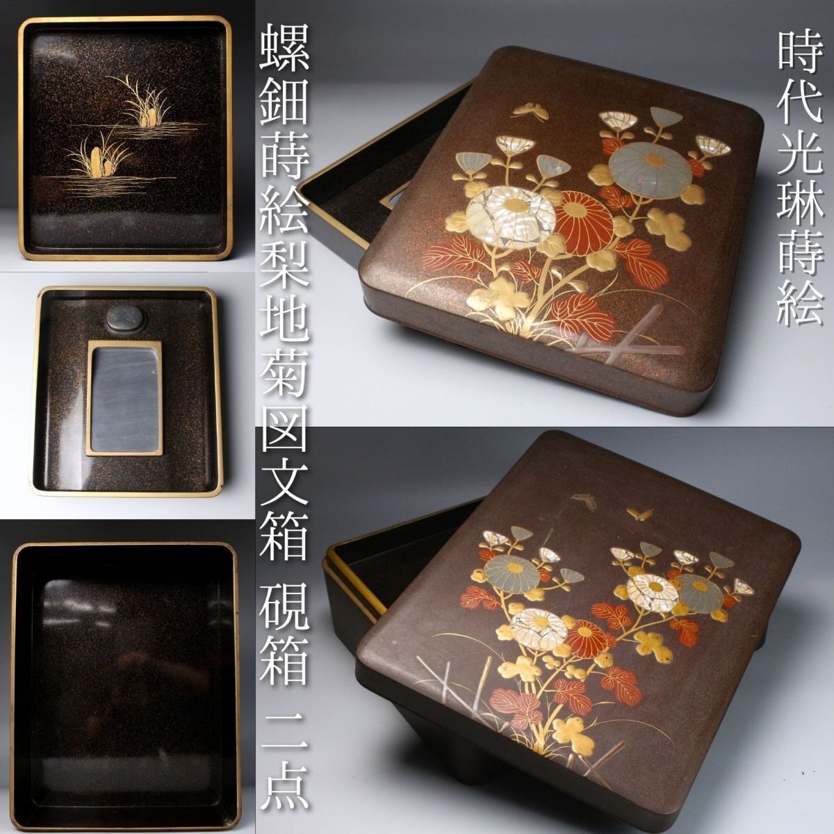 [.TP]25.10 25102821A* * * 商品詳細 * * * ここでしか出逢うことのできない唯一の美をご紹介させて頂きます。 時代を経た雅趣あふれる「光琳蒔絵 螺鈿蒔絵梨地菊文箱・硯箱」二点です。 華やかな菊文が梨地に浮かび上がり、螺鈿の光彩が静かにきらめく姿は、まさに琳派の美を今に伝えます。 箱内部には水辺文の内蒔絵が施され、外装との対比が見事で、 金と螺鈿が織りなす深い光沢の中に、優美で洗練された美意識が息づきます。 筆の香り漂う硯箱とともに、往時の文人趣味を偲ばせる格調高い一対。 時代の風格と繊細な蒔絵技が見事に調和した、趣ある逸品です。 ■商品内容/ 硯箱、文箱 ■サイズ/硯:横21.5㎝×高4㎝×奥行24.5㎝ 文箱:横32.5㎝×高12.5㎝×奥行41㎝ ■状態/ スレ、傷、汚れ、ヒビ、欠け、剥がれがございます。 ※写真にてご確認、ご了承の上ご入札下さい。