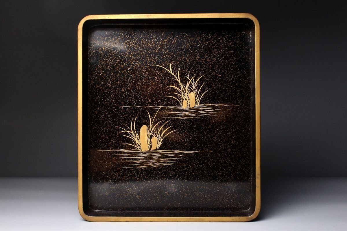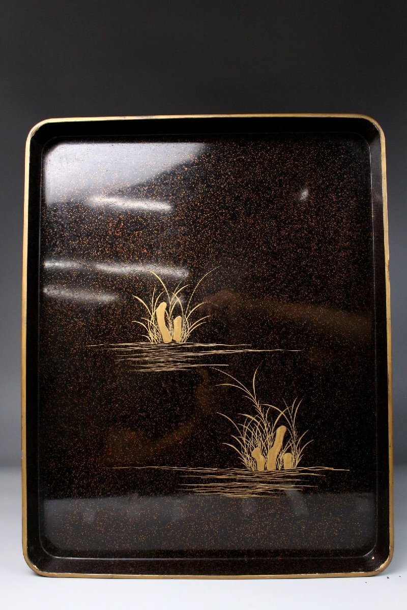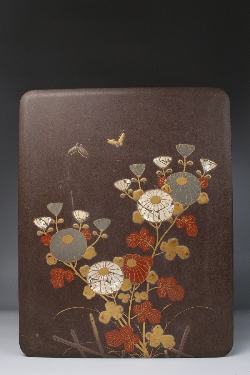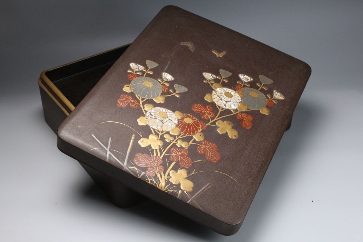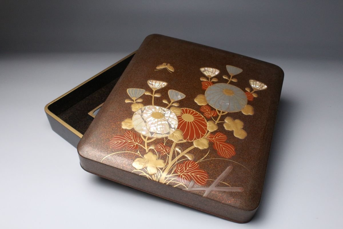 [.TP]25.10 25102821A* * * 商品詳細 * * * ここでしか出逢うことのできない唯一の美をご紹介させて頂きます。 時代を経た雅趣あふれる「光琳蒔絵 螺鈿蒔絵梨地菊文箱・硯箱」二点です。 華やかな菊文が梨地に浮かび上がり、螺鈿の光彩が静かにきらめく姿は、まさに琳派の美を今に伝えます。 箱内部には水辺文の内蒔絵が施され、外装との対比が見事で、 金と螺鈿が織りなす深い光沢の中に、優美で洗練された美意識が息づきます。 筆の香り漂う硯箱とともに、往時の文人趣味を偲ばせる格調高い一対。 時代の風格と繊細な蒔絵技が見事に調和した、趣ある逸品です。 ■商品内容/ 硯箱、文箱 ■サイズ/硯:横21.5㎝×高4㎝×奥行24.5㎝ 文箱:横32.5㎝×高12.5㎝×奥行41㎝ ■状態/ スレ、傷、汚れ、ヒビ、欠け、剥がれがございます。 ※写真にてご確認、ご了承の上ご入札下さい。