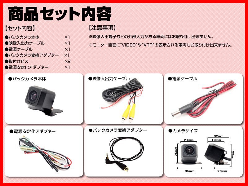 | ・バックカメラ本体 × 1 ・電源ケーブル × 1 ・映像ケーブル × 1 ・固定用ネジ × 2 ・電源安定化キット × 1 ・映像出力変換アダプター × 1 |