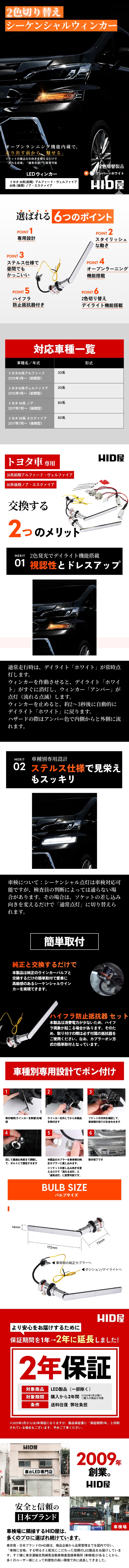 | 【商品について】 トヨタ 30系 アルファード/ヴェルファイア(前期) 、80系 ノア/エスクァイア(後期) 対応のデイライト機能付きシーケンシャルウインカー。オープンランニング機能が搭載されています! 1つのウィンカーバルブに「ホワイト」と「アンバー」の2色を搭載。 ●デイライト機能:ウィンカーを使用していない時は、ホワイト色で常時点灯します。 ●ウィンカー機能:ウィンカーを出すとアンバー色で点灯し、 ・流れる点滅(シーケンシャル) ・通常点滅のどちらかを選択できます。 ※お取り付けの際に、ソケットの差し込みの向きを入れ替えると「流れる点滅(シーケンシャル」または「通常点滅」に変更可能です。 ●オープンランニング機能搭載● エンジン始動時にウェルカムイルミネーションが点灯します! 1.アンバーが3回流れ、 2.続いてホワイトが2回往復で流れ、 3.その後、通常のポジション(ホワイト)が常時点灯します。 ※オープンランニングの際に、ウィンカーを出すと、オープンランニング機能がすぐに停止し、アンバーで点滅します。 【色】アンバー × ホワイト 【LEDチップ】特注の明るいLEDチップ 11基搭載 【素材 バルブ部分】亜鉛合金 衝撃に強く、振動を吸収する性能に長けた素材です。 【素材 レンズ部分】PCレンズ 衝撃に強く割れにくい性質で曇りにくく、クリアを保ちます。 【商品内容】 ●LEDウインカーバルブ 2球 ●抵抗器×2 ●エレクトロタップ ×2 ●取扱説明書×1 【保証】2年保証 【注意点】 ■お買い物ガイドに詳細が記載されています。 ■お客様に少しでも安価でご提供させて頂くために高価な箱は使わず簡単な包装にさせて頂いております。 ■バージョンアップした商品は予告無しに外観が変わる場合がございます。あらかじめご了承ください。 ■いかなる場合でも取り付けに掛かった工賃や、破損部品の弁償などは行いません。 |