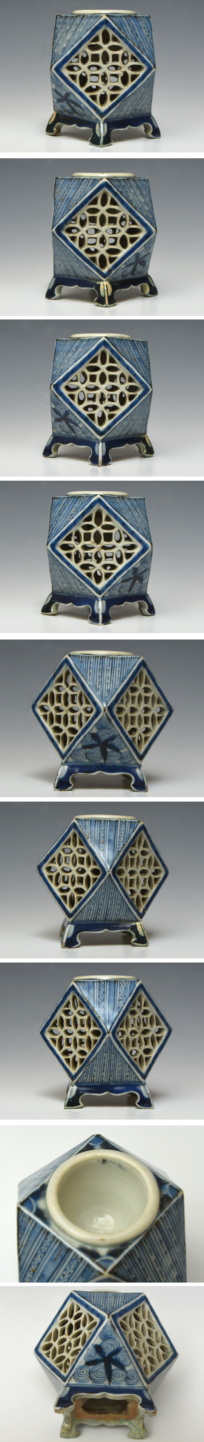 透かしを取り入れた構造が特徴的な、伊万里の盃台です。 幾何的な構成の中に染付の線描が施され、そこから生まれる静かな緊張感が、道具としての役割を超えた美を感じさせます。 盃を載せる本来の用途のほか、鑑賞用としても十分に見応えのある一品です。 足に二ヶ所ほど修復跡が見られますが(写真参照)、全体的な状態は概ね良好でご使用には差し支えないかと思います。 ※予めご了承の上ご入札お待ちしております。 ※撮影の際に生じた写り込みなどがございます。 ご理解の程よろしくお願い致します。 |