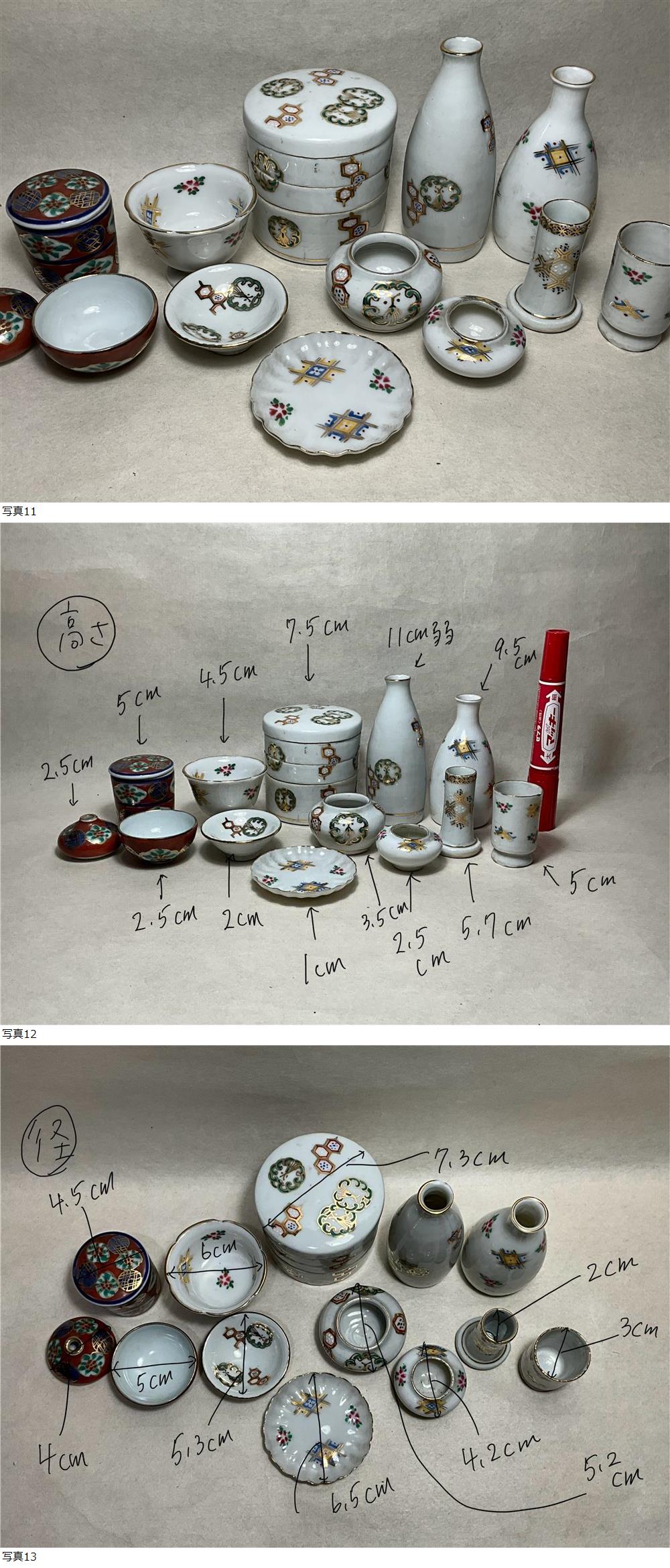 大きさは画像を参考にして下さい。茶巾筒?1コが橘吉、燕脂の3点が戦後のものですが、他は大正昭和初期頃の瀬戸物の雛道具と思います。