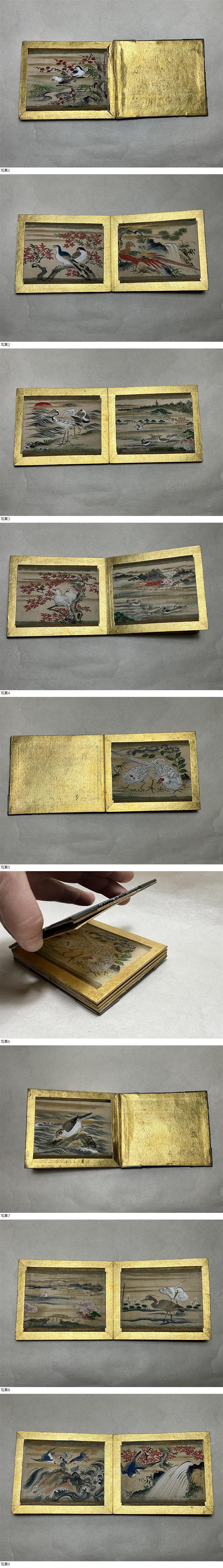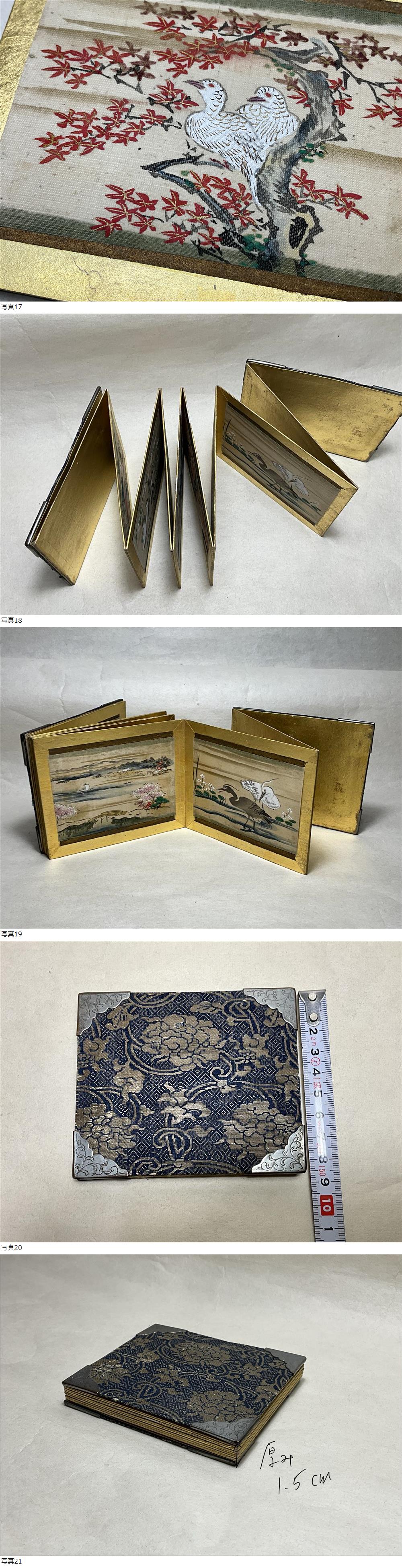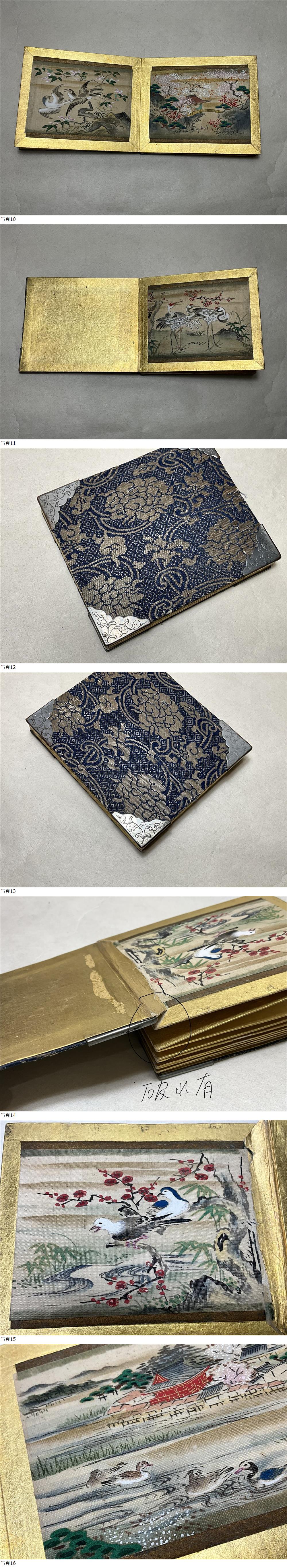 大きさは画像を参考にして下さい。小さな画帳、作者名はありません。装丁の裂地から幕末明治期頃と思われます。縁も金属の金具が施されています。