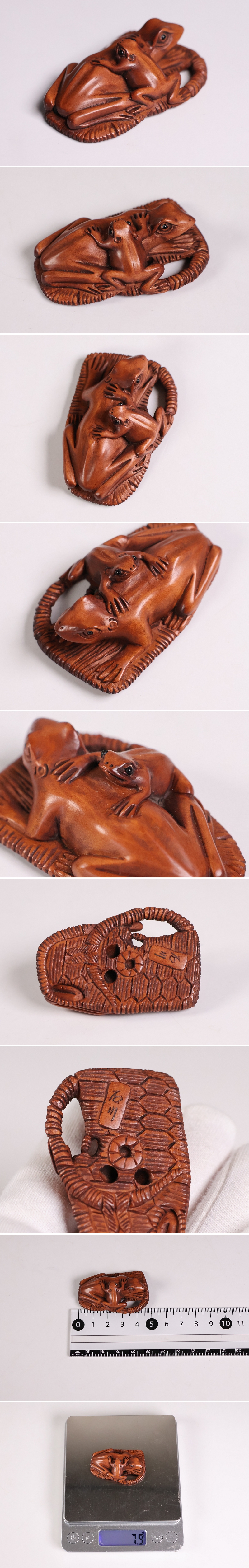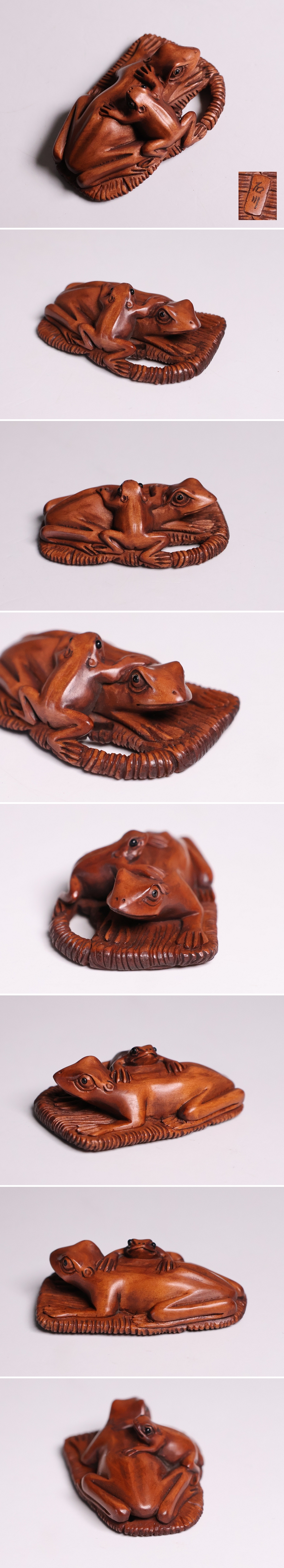 ◇木製 提物 根付 在銘 石川 草履に蛙 カエル 彫刻 木彫り【MB300】◇