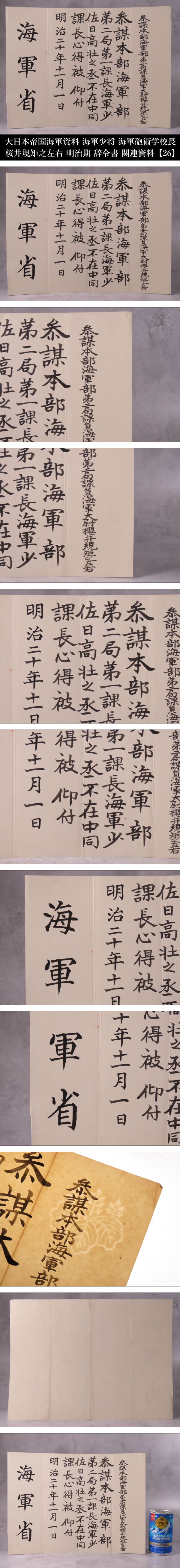 | Lot.20260423HA251129OSX/10 ※ご入札いただいた時点で下記記載事項全てにご了承いただいたものとさせていただきます。 ※商品タイトルは当方判断に基づき記載しております。また単にキーワードとして記載している場合もございますので予めご了承ください。 【ONE'S】大日本帝国海軍資料 海軍少佐 海軍砲術学校長 桜井規矩之左右 明治期 辞令書 関連資料 明治二十年十一月一日 【26】 桜井 規矩之左右(さくらゐ きくのすけ) 嘉永元年6月6日(1848年7月6日) - 大正元年(1912年11月27日)64歳没 日本の武士、大日本帝国海軍の軍人。海軍兵学校3期。最終階級は海軍少将。 海軍砲術学校長、巡洋艦「比叡」「松島」「千歳」「橋立」の艦長を歴任。 日清戦争において比叡艦長として特に黄海海戦で功績を残しました。 彼の貢献は日本の海軍史において重要な位置を占めています。 《幕末の佐倉藩に生まれ、海軍の礎を築いた「海の侍」。日清戦争・黄海海戦にて、絶望を希望に変えた奇跡の突撃。敵の巨大戦艦に包囲され、沈没か降伏かの絶体絶命の淵に立たされた軍艦「比叡」。その極限状態の中、桜井は「敵陣中央突破」という戦術の常識を超えた決断を下した。炎の中を突き抜けたその一閃は劣勢だった日本海軍を奮い立たせ、日本の運命を変えた伝説の男。》 なかなかお目にかかることのないお品物をこの一期一会のご機会にぜひ。 【商品状態】 掲載画像をご覧下さい。 あくまでも年代物かつ一度人の手に渡っているお品物のため、汚れ、変色、経年による劣化等があるものとお考えいただき、神経質な方のご入札はお控えください。 PC上の画像と商品の色目が若干異なる場合がございます。 説明文に記載のある品物や写真に写っているもの以外は基本的に付属致しておりません。 落札後のトラブルを避ける為にも、説明文および画像をよくご覧になってから、ご入札のほどよろしくお願い致します。 商品状態の記載に関してはあくまでも当方判断基準となっております。 状態等の詳細は写真をご確認いただき購入者各自のご判断にてご入札ください。 | |||
