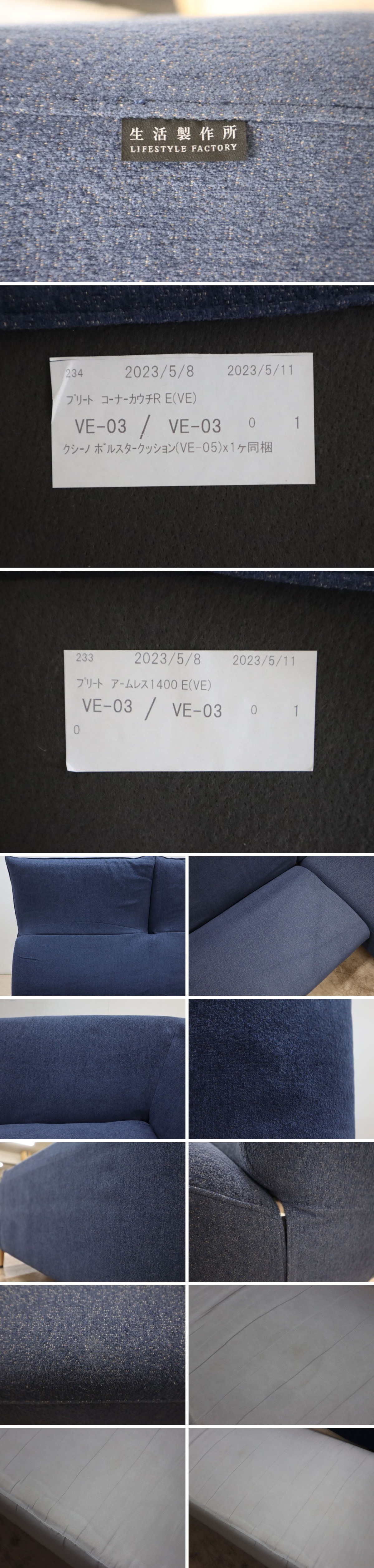 【仕様】 全体サイズ:約 W220×D172×H80~109・SH41cm、脚の高さ 約18cm ※実寸の為、多少の誤差はご了承ください。 個別サイズ:2Pソファ/約 W146(背もたれ部での採寸)×D76×H80~109cm、シェーズロング/約 W76×D172×H67.5cm ※実寸の為、多少の誤差はご了承ください。 張地:ファブリック カラー:ブルー系(画像は100%正確な色味では御座いませんので気になるお客様は世田谷区船橋の倉庫でご覧頂けます。色味による返品、返金等は一切お受けできませんのでご了承の上でご入札をお願い致します。) |