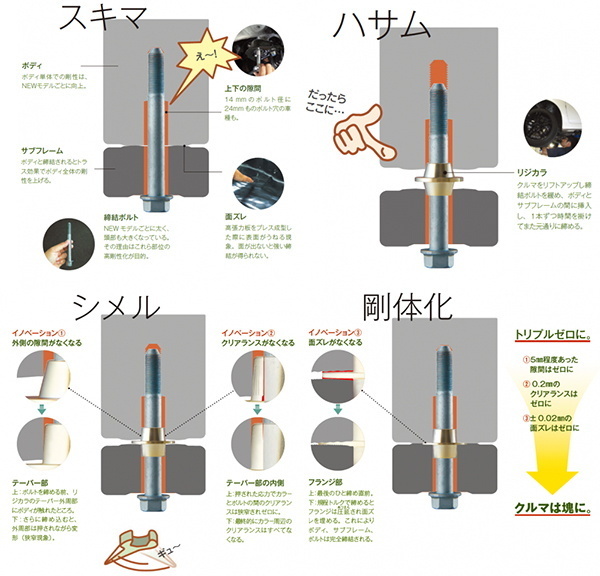 | 商品説明 | 工業製品である自動車は製造を容易にするため、 組み付け部に余裕が作られています、 重量物のエンジンやサスペンションを支えるメンバー部分(サブフレーム)にも、 ボルトの開口部が大きめに取られています。 この隙間や接触面のうねりにより、 外力を受けたときにわずかにずれが生じます。 車を支えている部分とボディのよじれ方が異なるため、 剛性感を下げる要因でもあります。 リジカラはテーパーのかかったジュラルミン製のワッシャーで、 このような隙間やうねりををぴったりと塞ぎます。 メンバーとボディを「一つの塊」にすることで、剛性感を高めます。 また面ずれが抑えられることで、 つき上げ感や振動の軽減も期待できます。 新機軸の剛性向上パーツにより、 安全性、乗り心地をもワンランク上へと向上させるでしょう。 ※メンバーとボディの間に入れるため、装着によりわずかに車高が上がります。 またメンバーを動かすため、ホイールアライメントに影響します。 出品内容は、以下となります。