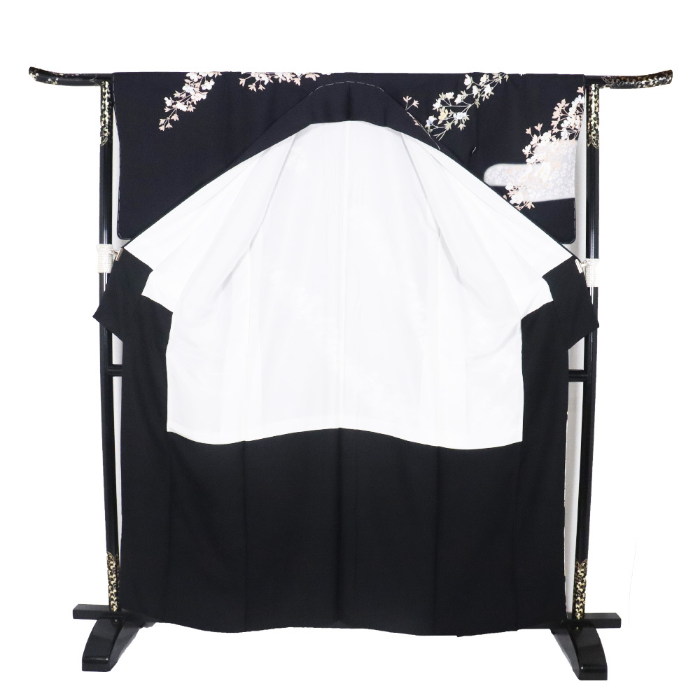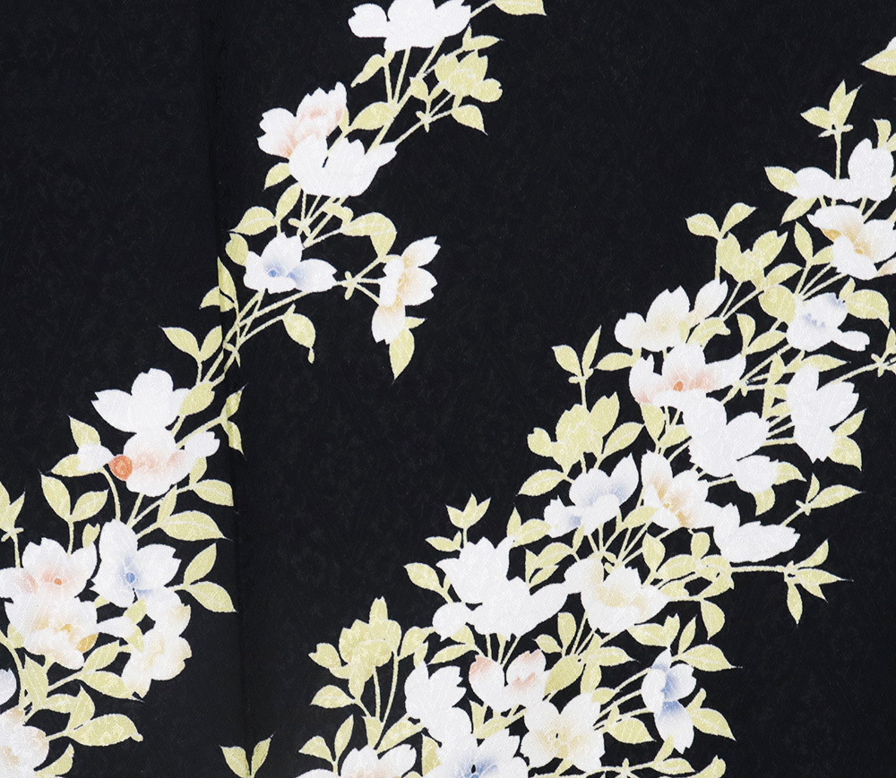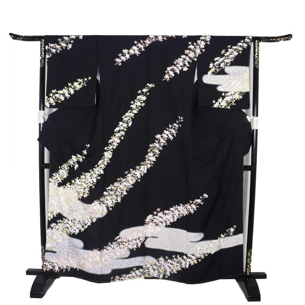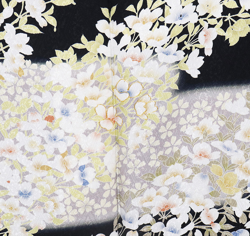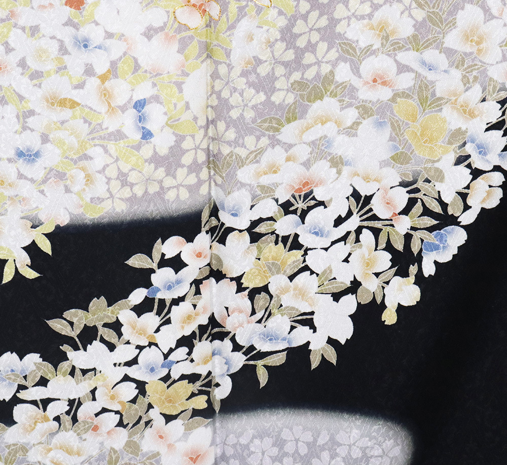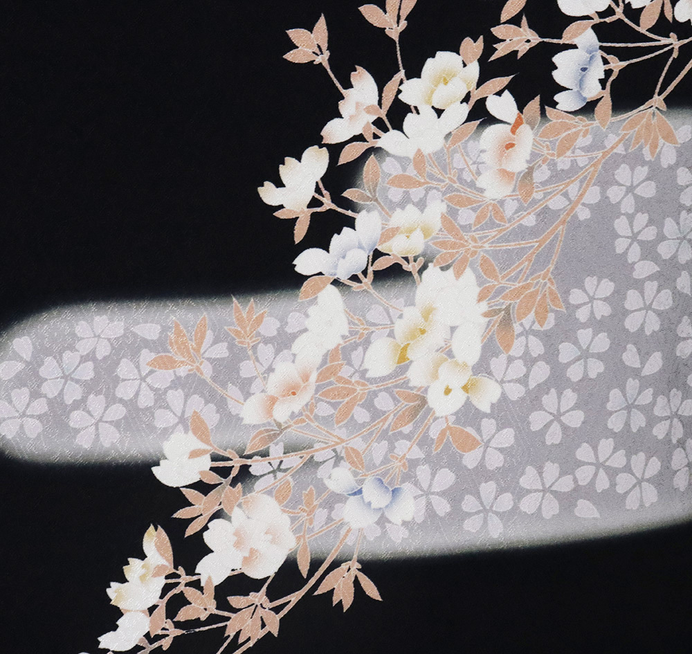 | 色・柄 | 友禅訪問着 袷 丹後縮緬地 黒・ピンク(灰桜色)・紫(紅藤色)暈し地 華菱文地模様地 桜満開 (写真では上手く色が出ない場合があります。ご了承下さい) |