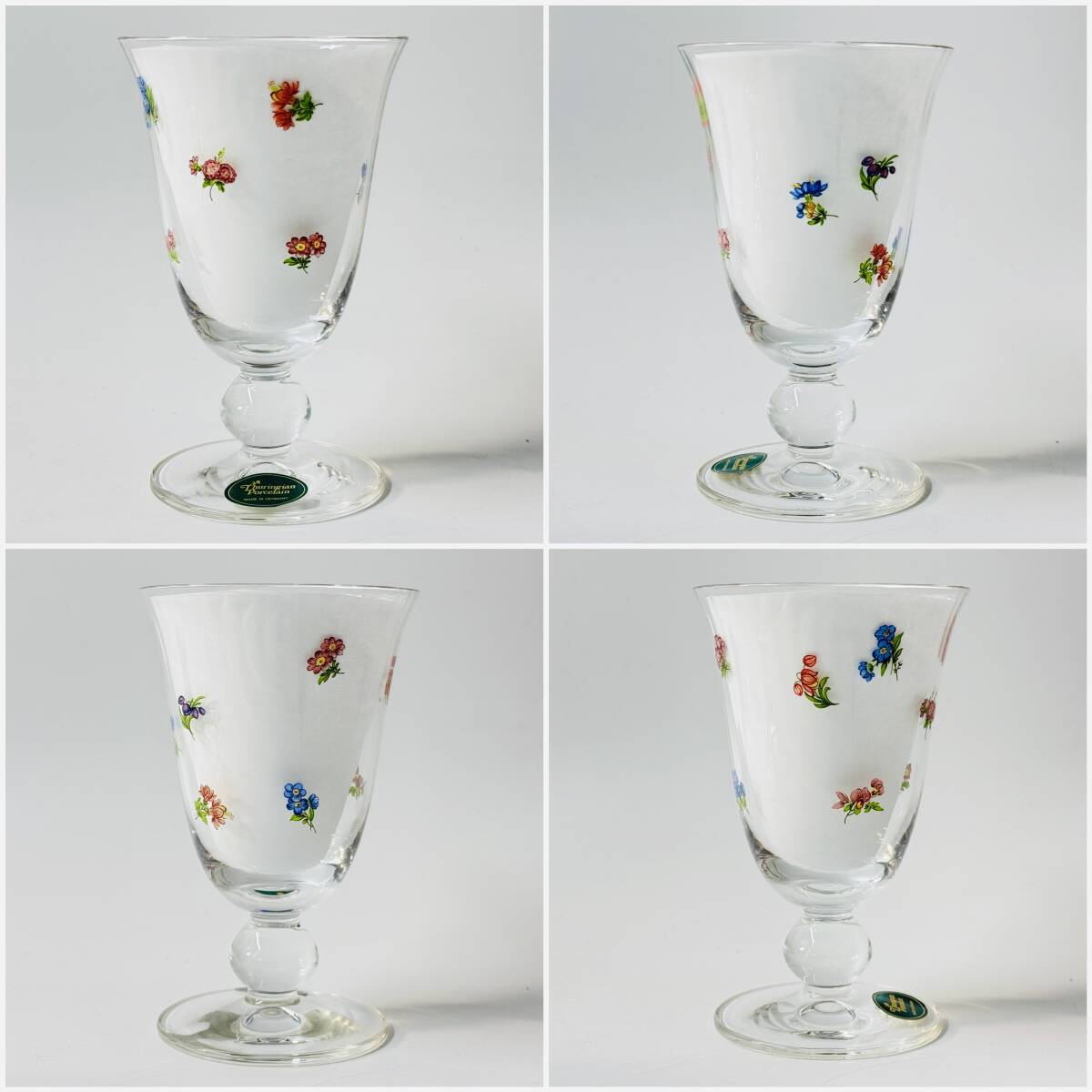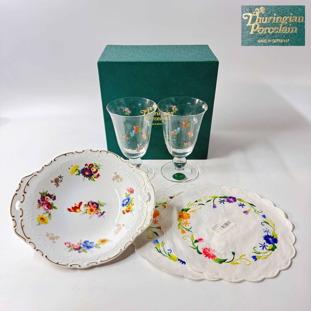 チューリンゲンの元箱に入っていますが、ライヒェンバッハのハンドル付きプレート、ショットツヴィーゼルのペアゴブレットグラス、Khn lt ren 輪花 ラウンドステッチクロスでそれぞれ似たような小花をあしらったフラワーモチーフのアイテムのセットのようです。