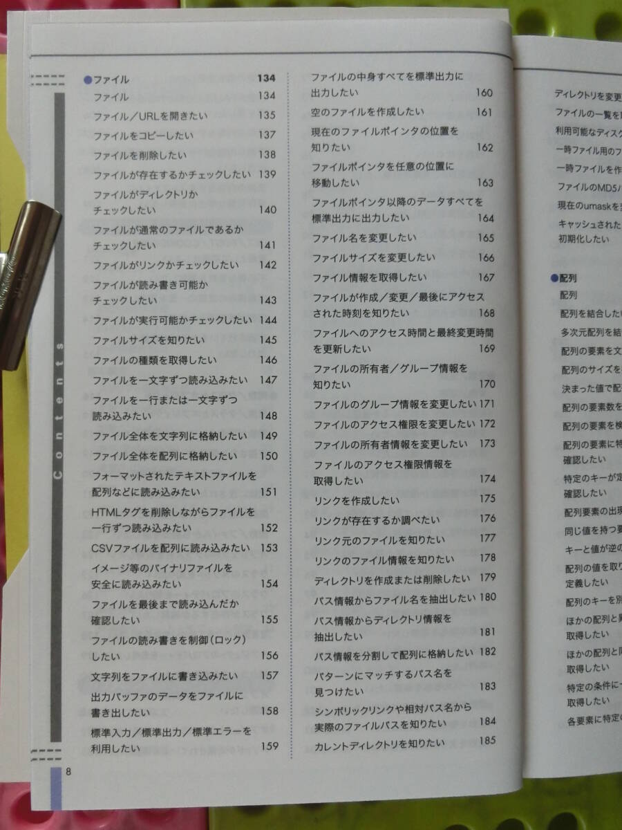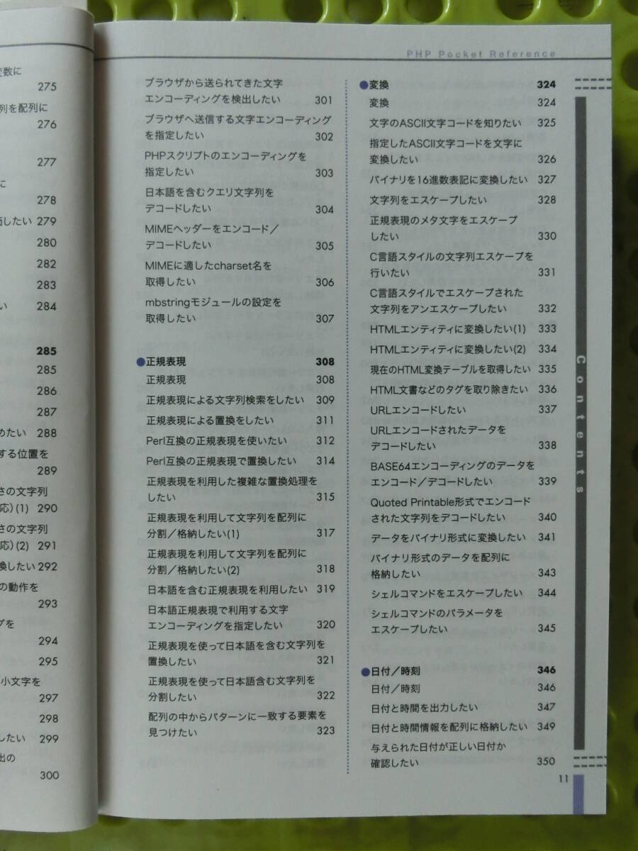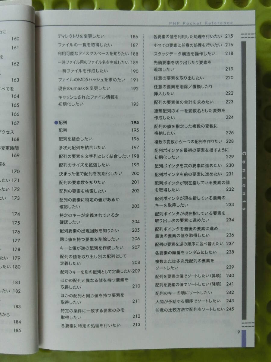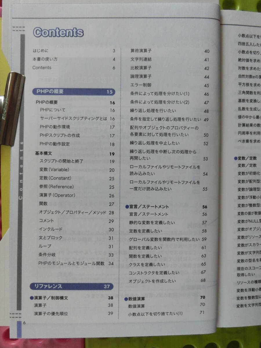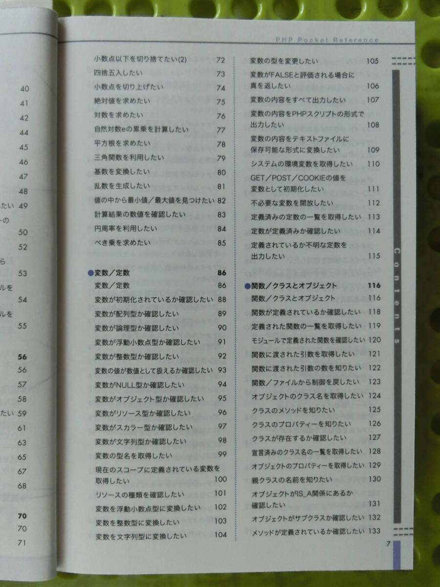 PHPポケットリファレンス,,2003_平成15年 3月 1日,リファレンス,配列やオブジェクト,現在のスコープ,ファイル全体,決まった値,決まった値,文字型データ,自動文字エンコーティング 発売日 2003_平成15年 3月 1日 発行 株式会社技術評論社 大きさ B6 PHP Pocket Reference ブックカバー,帯,ハガキ付 表紙 PHPポケットリファレンス 目次 Contents はじめに 3 本書の使い方 4 Contents 6 PHPの概要 15 PHPの概要 16 PHPについて 16 サーバーサイドスクリプティングとは 16 PHPの動作設定 18 基本構文 19 スクリプトの開始と終了 19 変数 (Variable) 20 定数 (Constant) 25 参照 (Reference) 25 演算子 (Operator) 26 関数 27 オブジェクト / プロパティー/メソッド 28 コメント 29 インクルード 30 文とブロック 31 ループ 31 条件分岐 33 PHPのモジュールとモジュール関数 34 リファレンス 37 ●演算子/制御構文 38 演算子 38 演算子の優先順位 39 算術演算子 40 文字列連結 41 比較演算子 42 論理演算子 44 エラー制御 45 条件によって処理を分けたい (1) 46 条件によって処理を分けたい (2) 47 繰り返し処理を行いたい 48 条件を指定して繰り返し処理を行いたい 49 配列やオブジェクトのプロパティーの 各要素に対して処理を行いたい 50 繰り返し処理を中止したい 52 繰り返し処理を中断し次の処理から 再開したい 53 ローカルファイルやリモートファイルを 読み込みたい 54 ローカルファイルやリモートファイルを 一度だけ読み込みたい 55 ●宣言 / ステートメント 56 宣言 / ステートメント 56 静的な変数を定義したい 57 定数を定義したい 58 グローバル変数を関数内で利用したい 59 配列を定義したい 61 関数を定義したい 63 クラスを定義したい 65 コンストラクタを定義したい 67 オブジェクトを作成したい 68 ●数値演算 70 数値演算 70 小数点以下を切り捨てたい(1) 71 小数点以下を切り捨てたい(2) 72 四捨五入したい 73 小数点を切り上げたい 74 絶対値を求めたい 75 対数を求めたい 76 自然対数eの累乗を計算したい 77 平方根を求めたい 78 三角関数を利用したい 79 基数を変換したい 80 乱数を生成したい 81 値の中から最小値/最大値を見つけたい 82 計算結果の数値を確認したい 83 円周率を利用したい 84 べき乗を求めたい 85 ●変数/定数 86 変数/定数 86 変数が初期化されているか確認したい 88 変数が配列型か確認したい 89 変数が論理型か確認したい 90 変数が浮動小数点型か確認したい 91 変数が整数型か確認したい 92 変数の値が数値として扱えるか確認したい 93 変数がNULL型か確認したい 94 変数がオブジェクト型か確認したい 95 変数がリソース型か確認したい 96 変数がスカラー型か確認したい 97 変数が文字列型か確認したい 98 変数の型名を取得したい 99 現在のスコープに定義されている変数を 取得したい 100 リソースの種類を確認したい 101 変数を浮動小数点型に変換したい 102 変数を整数型に変換したい 103 変数を文字列型に変換したい 104 変数の型を変更したい 105 変数がFALSEと評価される場合に 真を返したい 106 変数の内容をすべて出力したい 107 変数の内容をPHPスクリプトの形式で 出力したい 108 変数の内容をテキストファイルに 保存可能な形式に変換したい 109 システムの環境変数を取得したい 110 GET/POST/COOKIEの値を 変数として初期化したい 111 不必要な変数を開放したい 112 定義済みの定数の一覧を取得したい 113 定数が定義済みか確認したい 114 定義されているか不明な定数を 出力したい 115 ● 関数/クラスとオブジェクト 116 関数/クラスとオブジェクト 116 関数が定義されているか確認したい 118 定義された関数の一覧を取得したい 119 モジュールで定義された関数を確認したい 120 関数に渡された引数を取得したい 121 関数に渡された引数の数を知りたい 122 関数/ファイルから制御を戻したい 123 オブジェクトのクラス名を取得したい 124 クラスのメソッドを知りたい 125 クラスのプロパティーを知りたい 126 クラスが存在するか確認したい 127 宣言済みのクラス名の一覧を取得したい 128 オブジェクトのプロパティーを取得したい 129 親クラスの名前を知りたい 130 オブジェクトがIS_A関係にあるか 確認したい 131 オブジェクトがサブクラスか確認したい 132 メソッドが定義されているか確認したい 133 ● ファイル 134 ファイル 134 ファイル/URLを開きたい 135 ファイルをコピーしたい 137 ファイルを削除したい 138 ファイルが存在するかチェックしたい 139 ファイルがディレクトリかチェックしたい 140 ファイルが通常のファイルであるかチェックしたい 141 ファイルがリンクかチェックしたい 142 ファイルが読み書き可能かチェックしたい 143 ファイルが実行可能かチェックしたい 144 ファイルサイズを知りたい 145 ファイルの種類を取得したい 146 ファイルを一文字ずつ読み込みたい 147 ファイルを一行または一文字ずつ読み込みたい 148 ファイル全体を文字列に格納したい 149 ファイル全体を配列に格納したい 150 フォーマットされたテキストファイルを 配列などに読み込みたい 151 HTMLタグを削除しながらファイルを一行ずつ