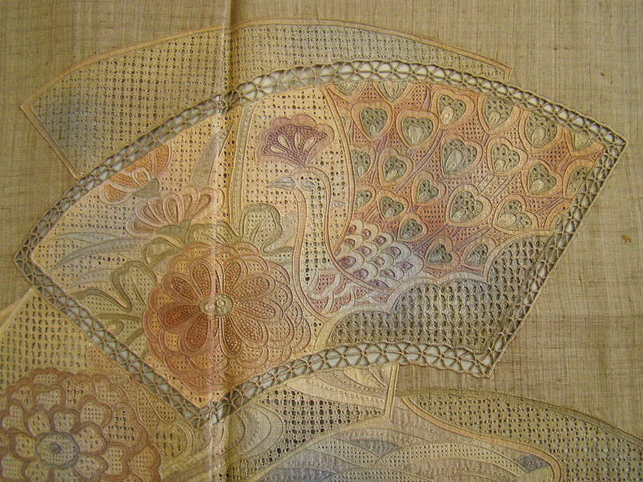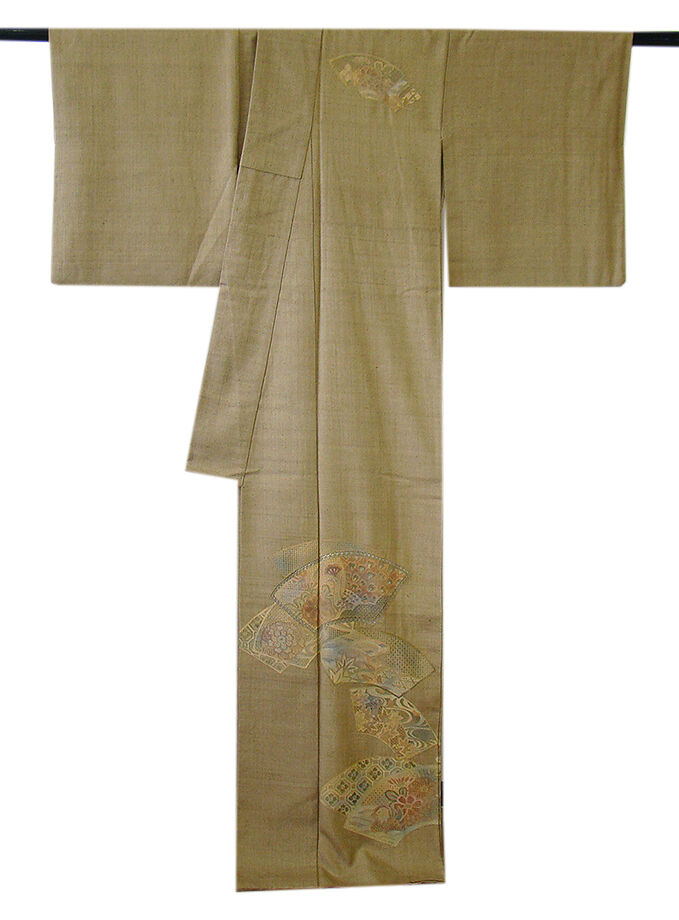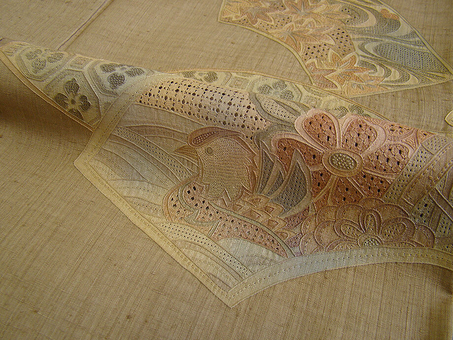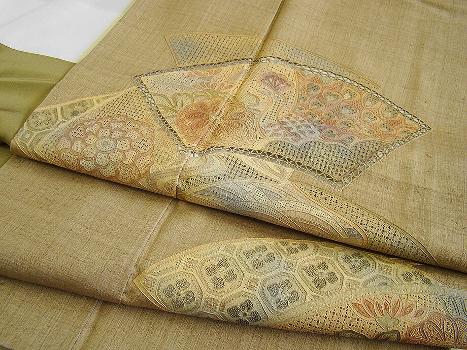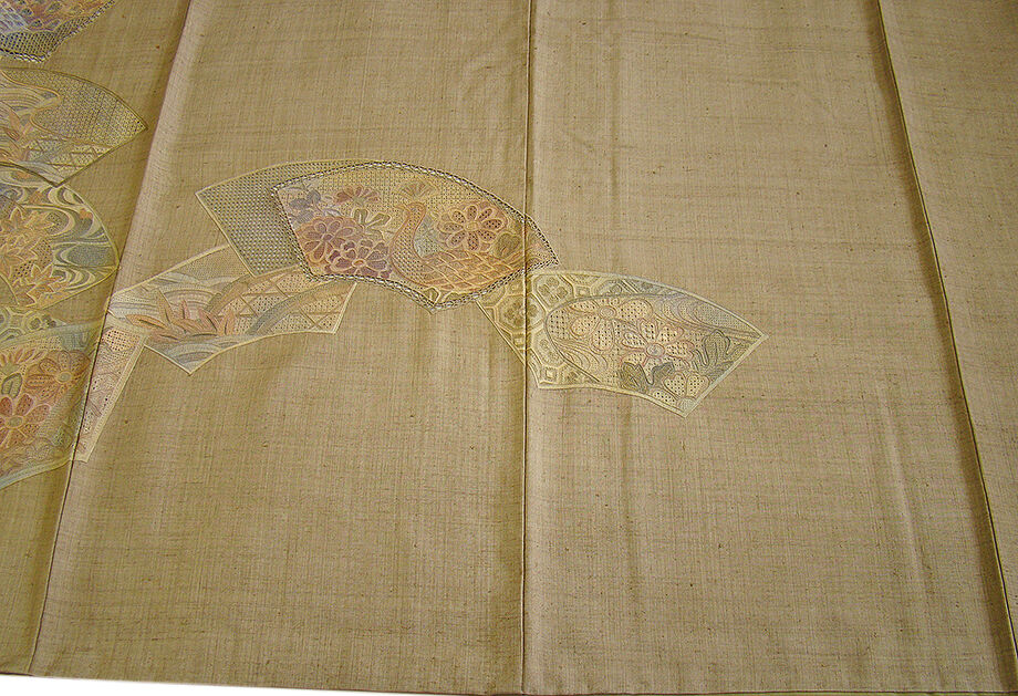 | ちょっと一言 | 洒落帯で粋に〆たい存在感溢れる豪華なスワトウ刺繍入りの温もり溢れる生紬の訪問着です。 帯や小物次第で様々なコーディネートをお愉しみ頂ける事と思います。 |