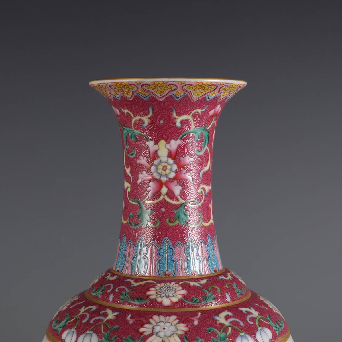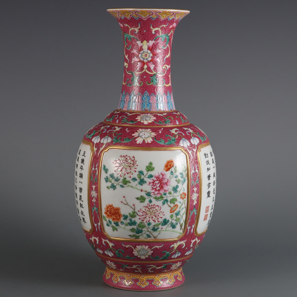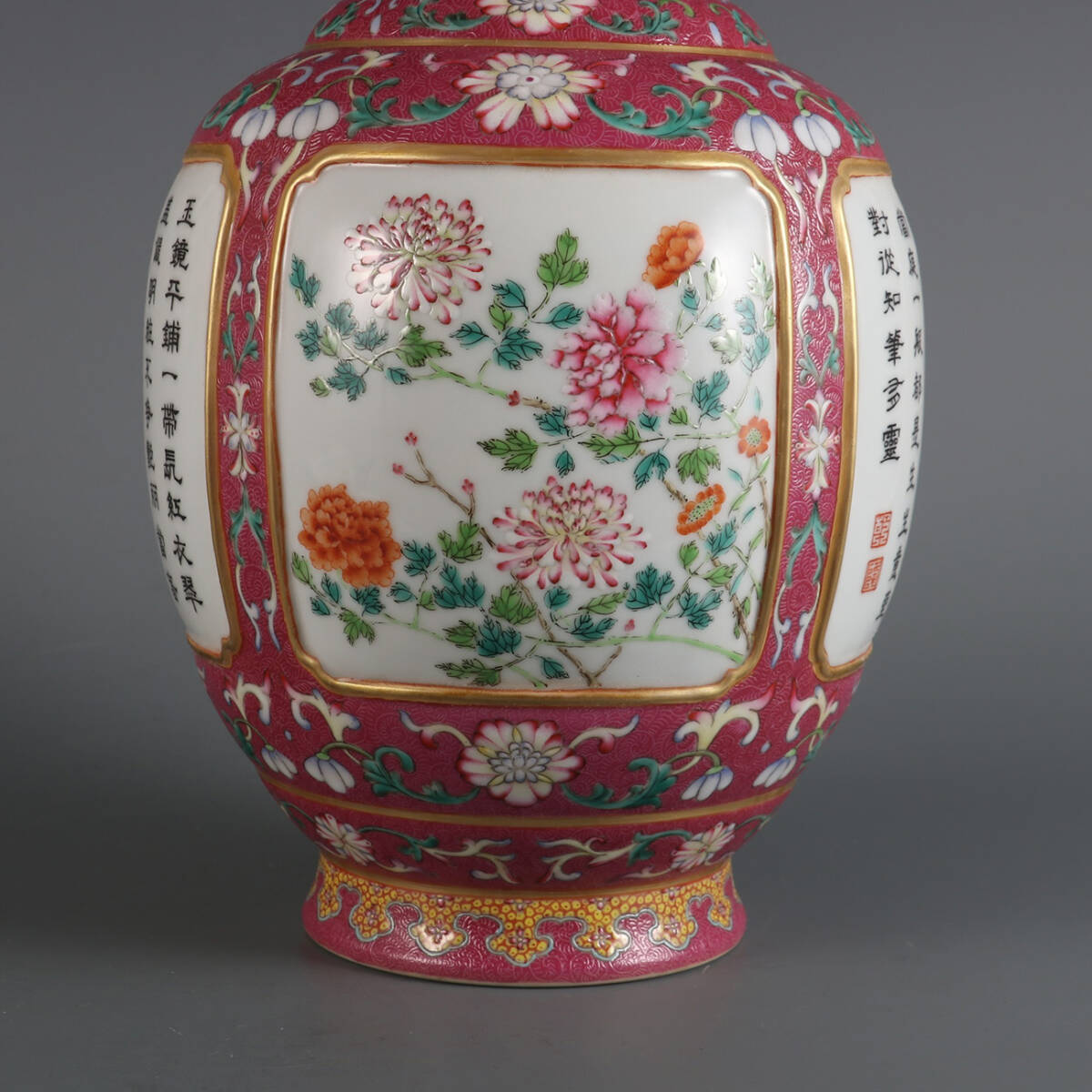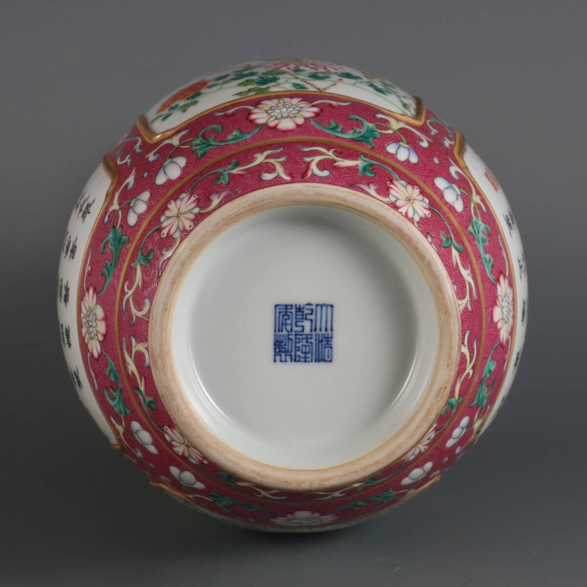 ◆御泓軒◆『清時代 陶磁器 臙脂紅地開窗花鳥紋題詩賞瓶 清乾隆年製款・箱付』極細工・古賞物・中国古玩・中国古美術