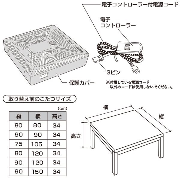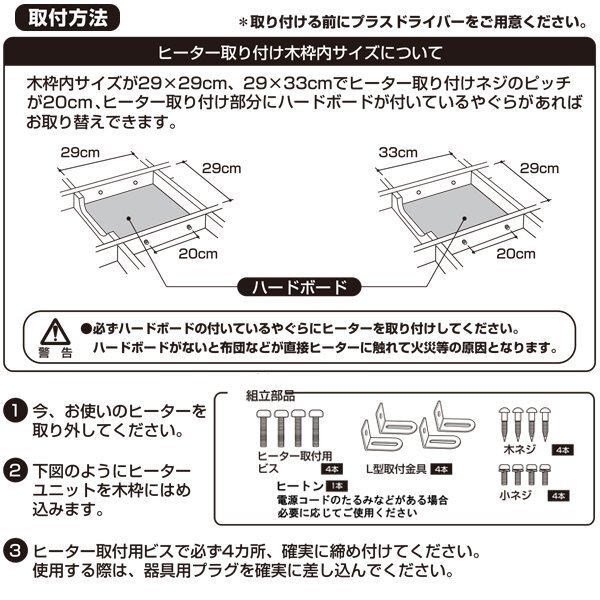 ※ヒーター取りつけ部分にハードボード(耐熱)の付いていないやぐらには 取り付けや取り替えができません。