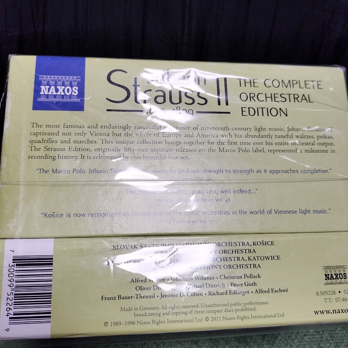出品者コメント:マルコポーロの偉業をかっぱった神ボックス。いまなら5万は下るまい マルコポーロ/ナクソス 神ボックス 管弦楽曲全集(52CD) カタログNo:8505226 ヨハン・シュトラウスⅡ世:管弦楽曲全集(52CD) MARCO POLOの大労作がナクソスからお買得価格でボックス化! 1997年に高価なボックスでも発売されたマルコポーロ・レーベル最大の労作シリーズが、今度はナクソスから登場します。 ヨハン・シュトラウス[1825-1899]が最初に作曲をしたのは6歳のときで、曲種はワルツでした。以後、実に67年ものあいだ作曲活動をおこない、500以上に及ぶ管弦楽曲や劇場音楽など数多くの作品を書き上げて演奏、生涯通じて高い人気を博したことはよく知られています。特に創作のメインとなるワルツやポルカなどの管弦楽曲は、聴衆の期待に応えるため、強い情熱を持って書き進められたこともあってか非常に数が多くなっているようです。 それらのうち、特に人気のある作品については、ニューイヤーコンサートなどウィーンの演奏家たちのおかげで世界的な知名度を得ていますが、有名曲に匹敵する内容を持ちあわせながらもあまり知られていない作品が多いのもまた事実。 実際、このマルコポーロのシリーズでのレコーディングが世界初録音だったという作品もかなり多く、ヨハン・シュトラウスⅡ世の管弦楽曲の全貌に手軽に接することができるという意味でも、今回のナクソスからの廉価でのボックス化は歓迎されるところです。 マルコポーロの当シリーズのスタートは1988年のことで、オーストリアの出版社ドブリンガーや、英ヨハン・シュトラウス協会の全面的な協力を得て、1996年の全集完成まで計画的に仕事が進められ、オリジナルの479作品に加えて、多数の編曲ものや補筆完成もの、合唱曲まで含む全部で587に及ぶ作品が収録されています。 たとえば『美しく青きドナウ』は3ヴァージョン収録されていますし、『春の声』や『酒・女・歌』も2ヴァージョン入っているなど、有名曲のヴァージョン比較も楽しめるのも面白いところです。(HMVより) AI解説 ナクソスからリリースされているシュトラウスの52枚組CDボックスは、ヨハン・シュトラウス2世の全管弦楽曲を収録した決定版です。元々はマルコ・ポーロ・レーベルから分売されていたシリーズをボックス化したもので、膨大な曲目と複数の演奏者が含まれています。全52枚分のディスク別曲目・演奏者リストは非常に長大になるため、主要な情報源として、このボックスセットの概要と、収録されている主要な演奏者をお伝えします。ナクソス 52CD シュトラウス管弦楽曲全集 (8.505226) 概要 商品の情報 ウイーンナームジークファンとしてはこれほ... 投稿日:2022/04/11 (月)CD・DVD・ブルーレイ > CD > クラシック ウイーンナームジークファンとしてはこれほどありがたい企画はない。 今は亡き保柳健さんは最後まで見届けることが出来なかった。 是非聞いて欲しかった。 演奏は可もなく不可もないがまあ良いでしょう。 次はエドゥワルト全集を目指してほしいが 2集で頓挫してしまった。 彼のワルツは兄たちにない憂いがあって傑作も多い。 是非全集を目指してしてもらいたい!目立った傷や汚れなし おかぽん さん|静岡県|不明 共感する2素晴らしいCDセットだ。このCDセットで... 投稿日:2021/07/25 (日) 素晴らしいCDセットだ。このCDセットでヨハン・シュトラウスⅡ世の管弦楽曲を全て聴くことができる。オペレッタが苦手なので、ヨハン・シュトラウスⅡ世の音楽を知るにはこれで十分だ。指揮者とオーケストラがメジャーではないが、変なクセのない生き生きした自然な演奏で曲本来の姿を楽しめる演奏になっている。音質にも不満はない。大音量で聴き入っても、小音量でBGM的に聞き流しても最高の時間を過ごすことができる。 たまお さん|長野県|不明 共感する319世紀ウイーンに登場したワルツの大成者... 投稿日:2018/04/18 (水) 19世紀ウイーンに登場したワルツの大成者の書いた、ほぼ全ての作品をあますことなく集成および録音した、その偉業ぶりを記念して出されたマルコポーロ盤からのナクソス盤への移行的転売リリースによる廉価によるボックス・セットの再登場である。1999年にワルツ王シュトラウス2世の没後100年のアニヴァーサリー・イヤーであった際に、愛知県のアイヴィー社より鶴間圭監修の別冊の日本語解説書2000円と併せて7万円を超える高価格帯でのボックス・セットであったのものが、1987年の会社設立当初より市場価格の設定の安いナクソスから再発売となったという出自を持つ経緯だ。どの作品も均一的で嫌味のない安定感がバランスよく配合されている感じが強く、その点が当ボックス・セットの人気と需要を根強く物語っている様だ。例外的に当ボックスのVol・26巻と27巻は本家本元のウイーンのORF交響楽団の演奏によっているのが嬉しい魅力。その他、特記すべくは、この作曲家が1872年に当時の新世界国アメリカへと遠征興行した時の作品たちや、死後に