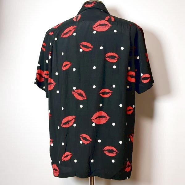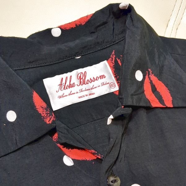【アロハブロッサム キス柄 リップ柄 アロハシャツ 40 レーヨン aloha blossom KISS ブラック 日本製 半袖シャツ】