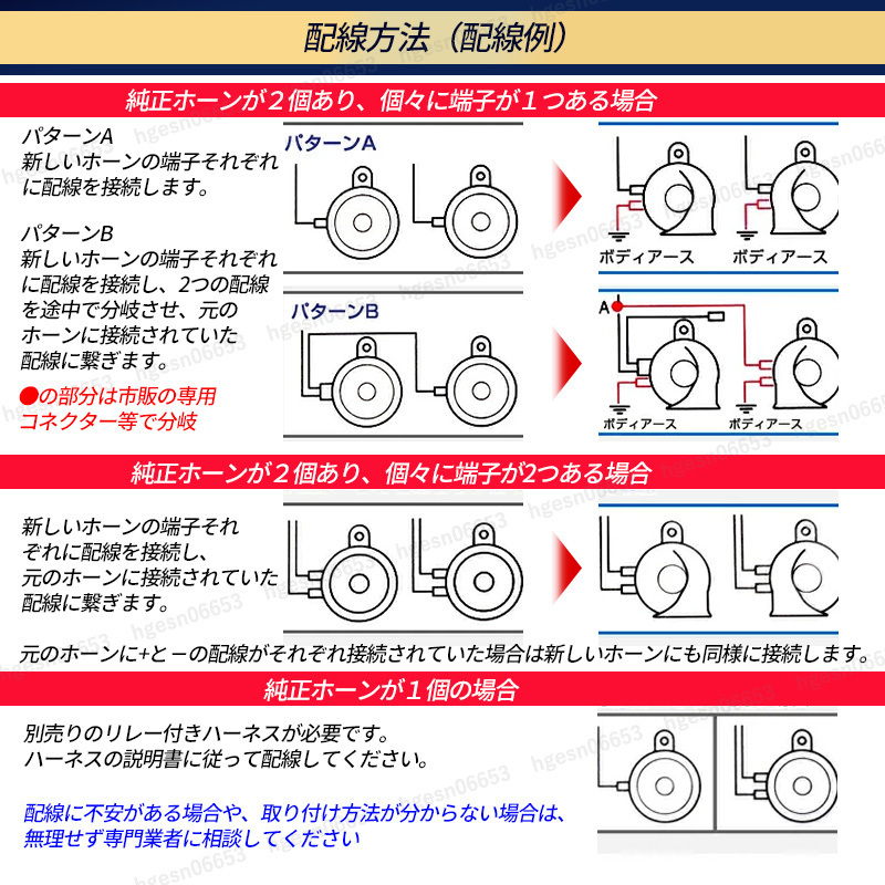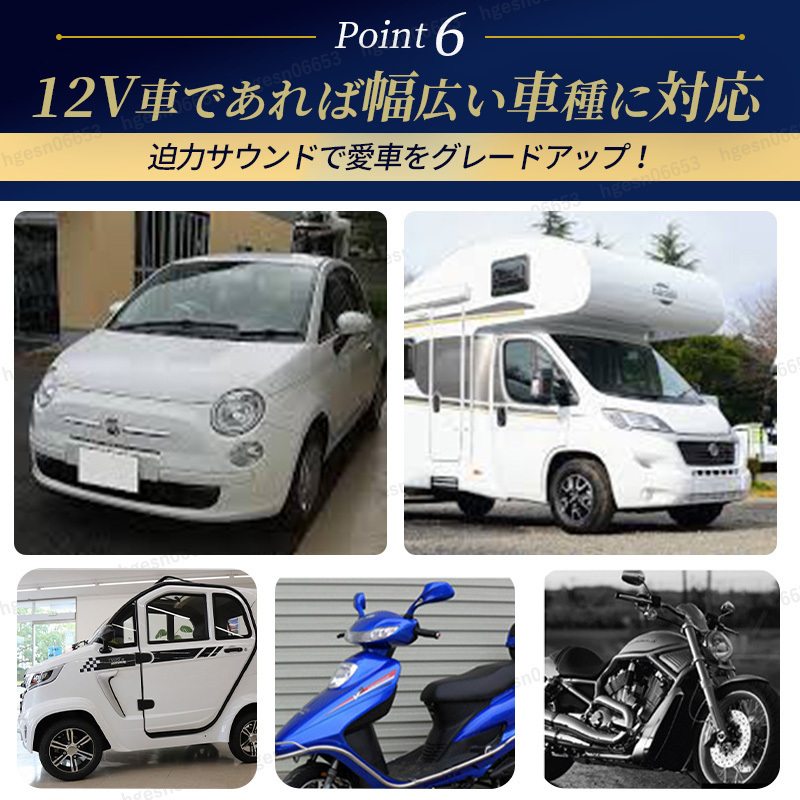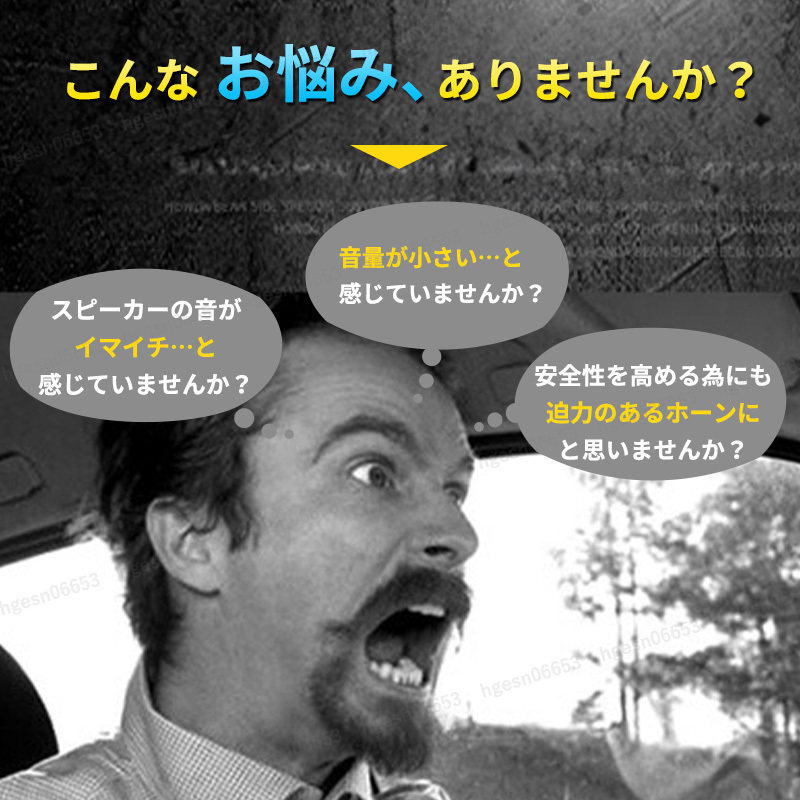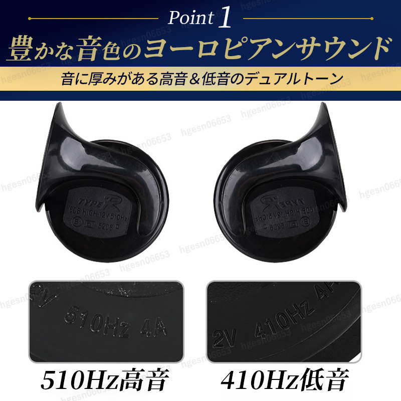 ![]() 高級感あふれるサウンドで、愛車をワンランクアップ! 省スペース型ヨーロピアンホーン 普段の運転をもっと特別な時間へ。愛車のホーンを、 重厚感と高級感あふれるヨーロピアンサウンドに変身させる、 省スペース設計のホーンユニットが登場しました。 クールなブルーカラーが、さりげなく個性を主張し、 あなたの愛車をスタイリッシュに演出します。 ●コンパクト設計で取り付けもスマートに 高級感のあるサウンドでありながら、このホーンユニットは 驚くほどコンパクト。 スペースが限られた車両にも取り付けやすい省スペース設計です。 付属のクランク型ステーを使用すれば、様々な場所への 設置が可能です。 ●耐久性も考慮した高品質 過酷な環境下でも安心してご使用いただけるよう、 耐久性にもこだわりました。 防塵防水設計に加え、ABS素材を採用することで、 高い耐食性と耐久性、そして耐高温性を実現。 多層塗装による高い抗酸化性も備え 長く美しい状態を保ちます。 ●こだわりのディテール 渦巻き型ホーン: 重厚感のあるサウンドを生み出す渦巻き型構造。 省スペース設計: 取り付け場所を選ばないコンパクト設計。 耐久性に優れた素材: ABS素材と多層塗装で、 高い耐久性と耐候性を実現。 セット内容 ホーン(Hi) × 1 ホーン(Lo) × 1 クランク型ステー × 2 ナット × 2 仕様 定格電圧:DC12V 電流:3.8A × 2 周波数:ヨーロピアン(High:510Hz、Low:410Hz) 音量:117±3db サイズ:最長部約9.0cm × 約9.5cm × 約6.7cm 重量:約234g あなたの愛車を、音からアップグレードしませんか? この省スペース型ホーンユニットで、あなたの愛車のサウンドを、 周囲を魅了するような高級感あふれる音色に変えてみてください。 きっと、運転するたびに特別な気分を味わえるはずです。 安全にご使用いただくために ※取付作業、取付方法について当店ではサポートは行っておりません。 お客様の責任にて行ってください。 ※こちらの商品は汎用品となります。車種適合や取付可否については お答えできかねます。ご了承ください。 ご購入前に車両の設置スペースや製品寸法をご確認いただいた 上でお申し込みください。 ※本製品は12V自動車用となります。 他の用途にはお取付けや使用はしないでください。 ※取付け位置により、配線の延長など加工が必要な場合がございます。 ※本製品の取り付け方、取付位置により音量不足、音の反響、 こもり等で道路運送車両法の保安基準に適合しない場合があります。 製品の性質をご理解いただいた上でご使用ください。 ※取付前、取付後に発生したいかなる事故損傷につきましては 当店は一切責任を負いかねます。また損害賠償等にも応じかねます。 ※本製品は使用する環境温度が極端に高温や低温になると、 音圧が変化することがありますが故障ではありません。 ※お取付けの際は高温になる場所、振動の激しい場所、 水のかかる場所は避けてください。 ※配線は高温の場所、ファンやベルトなどの回転や稼働する 補器類に接触しないように避けて固定してください。 ※水のかかる場所を避けてホーンの開口部が必ず下になるように 取り付けてください。水が入ると音が小さくなるだけでなく、 故障の原因となります。 ※ホーン裏側の樹脂封印部分を触らないでください。 (調整が狂う為、故障の原因となります) ※製品の分解や改造は危険ですので絶対に行わないでください。 ※動画掲載のホーンの音色はあくまで参考としてご試聴ください。 実際の製品の音色は試聴環境や製品の装着状況等により 多少異なって聞こえる場合がございます。 ※予告無く仕様を変更する場合がございます。ご了承ください。 | ||