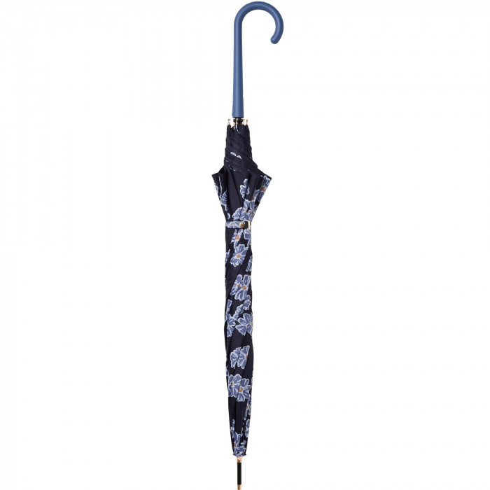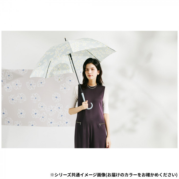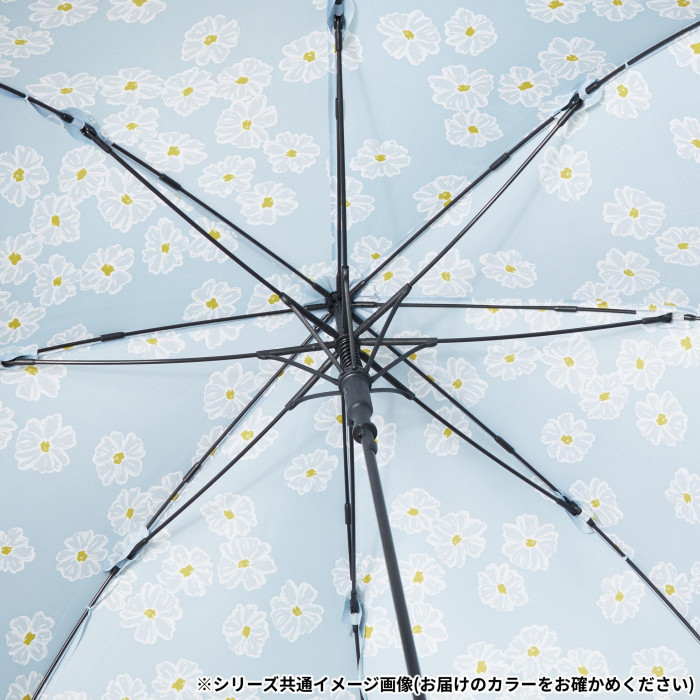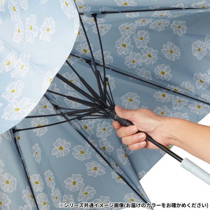 | 反動軽減機能でソフトに傘が開く。骨が動いて衝撃を受け流す耐風性能です。ふわっとしたタッチで描いた満開のマーガレット。甘くなりすぎないようカラーは落ち着いたものをチョイス。オフィススタイルにも合わせやすい。 |