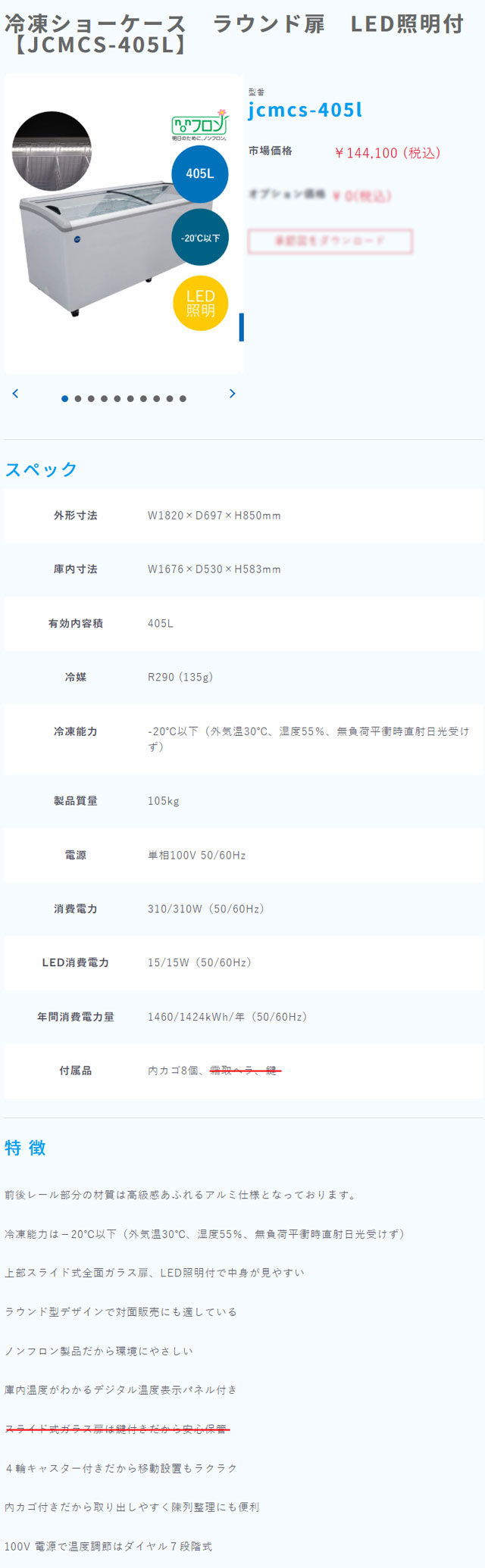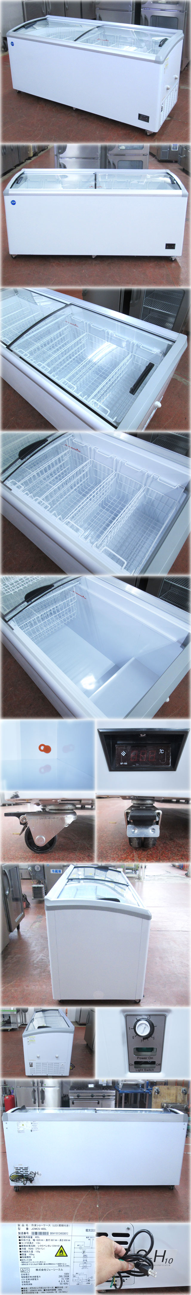 JCM 冷凍ショーケース JCMCS-405L を出品いたします。 ■特徴■ 前後レール部分の材質は 高級感あふれるアルミ仕様となっております。 冷凍能力は-20℃以下 (外気温30℃、湿度55%、無負荷平衝時直射日光受けず) 上部スライド式全面ガラス扉、 LED照明付で中身が見やすい ラウンド型デザインで対面販売にも適している ノンフロン製品だから環境にやさしい 庫内温度がわかるデジタル温度表示パネル付き 4輪キャスター付きだから移動設置もラクラク 内カゴ付きだから取り出しやすく陳列整理にも便利 100V 電源で温度調節はダイヤル7段階式 ■仕様■