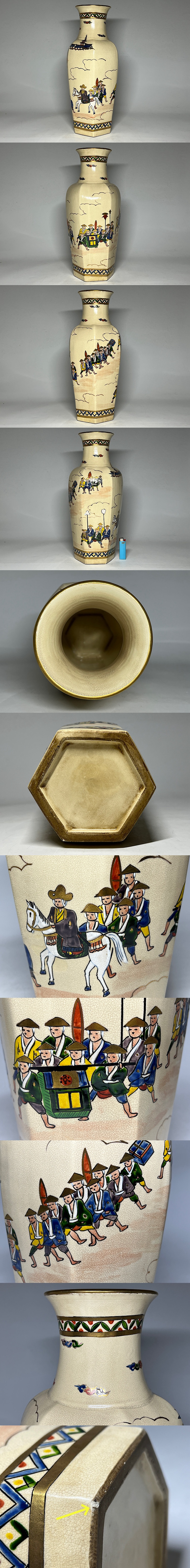 清水焼 色絵大名行列図 六角形 大花瓶 高:41.8cm *(底に1ヶ所カケ有) ◆商品詳細 寸法(約):41.8x16.8x10.8(高×幅×口径cm) ※寸法に若干の誤差が生じる場合もございます。 汚れ、底に1ヶ所カケがありますので、 ご承知の上入札お願いします。 状態等画像にてご確認の上ご入札よろしくお願いいたします。 ◆発送先等のご連絡とお支払いについて ※発送先等のご連絡 落札時から48時間以内にお願い致します。 ※お支払 かんたん決済の期限内にお願い致します。 複数点落札時にまとめて取引の場合(72時間内)に、 まとめて取引の取引手順(落札者方の操作)を参考にお願い致します。 梱包したサイズを測って、地方によって送料を決めますので、よろしくお願いします。 ◆掲載画像について ※画像は現物を撮影しておりますが、照度、遮光、モニターによっては実物と 色目が異なって見えることがありますのでご注意ください。掲載画像では確認 できない傷や汚れがある可能性もございます、あくまで 中古品であるということをご承知の上、御入札をお願い致します。 ◆補償について 商品到着後はすぐに状態の確認をお願い致します。 商品の破損等がございまし たら、箱や梱包材など全てそのままの状態で保存し、お早めにご連絡ください。 (到着日から一週間以上経過、梱包材の廃棄済み等の場合、保証は致しかねます のでご注意ください。) ◆返品について 思っていたイメージと違う、などのお客様主観による返品はお受けできません ので、予めご了承ください。ノークレーム、ノーリターンでお願いします。届 いた商品が商品説明と著しく異なる場合(寸法、キズ記載ミスなど)のみ承り ます。早めにご連絡ください。 ◆注意事項 当方の希望価格と隔たりがある場合は、終了前にやむなく取下げさせて頂く場 合がございます。 ※商品ご落札翌日から4日間以内にご連絡が取れない場合は、入札取消の処置を 取らさせていただく場合がございます。 ※評価の悪い方は取り消す場合がございます。 ※原則として当方の不備以外のキャンセル・返品・返金は受け付けておりません。 以上の点を予めご了承頂いた上で、入札・落札お願い致します。 ◆発送方法 ▼ゆうパック(補償あり/追跡あり) 梱包後のサイズ:~約100cm ※送料全国一律1500円 (但し北海道、沖縄、離島は+500円いただきます。) 発送元は静岡県となります。 ( 商品の組み合わせによっては同梱をお断りさせていただく場合があります。) ※大型商品について 郵便局の規定を超える商品の場合は、佐川急便またはヤマトでの発送となります。 |