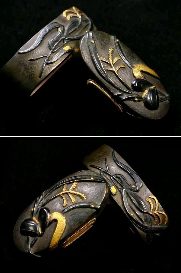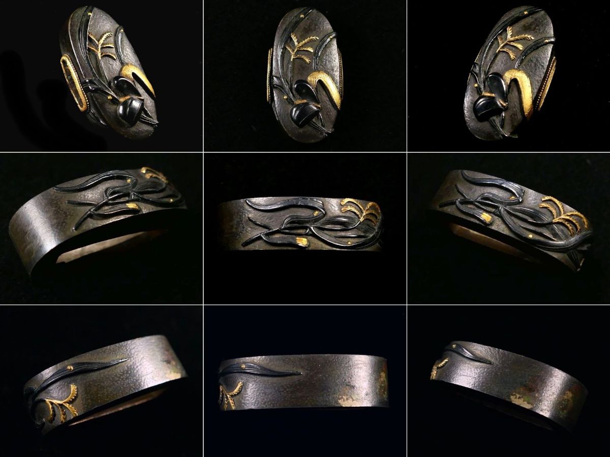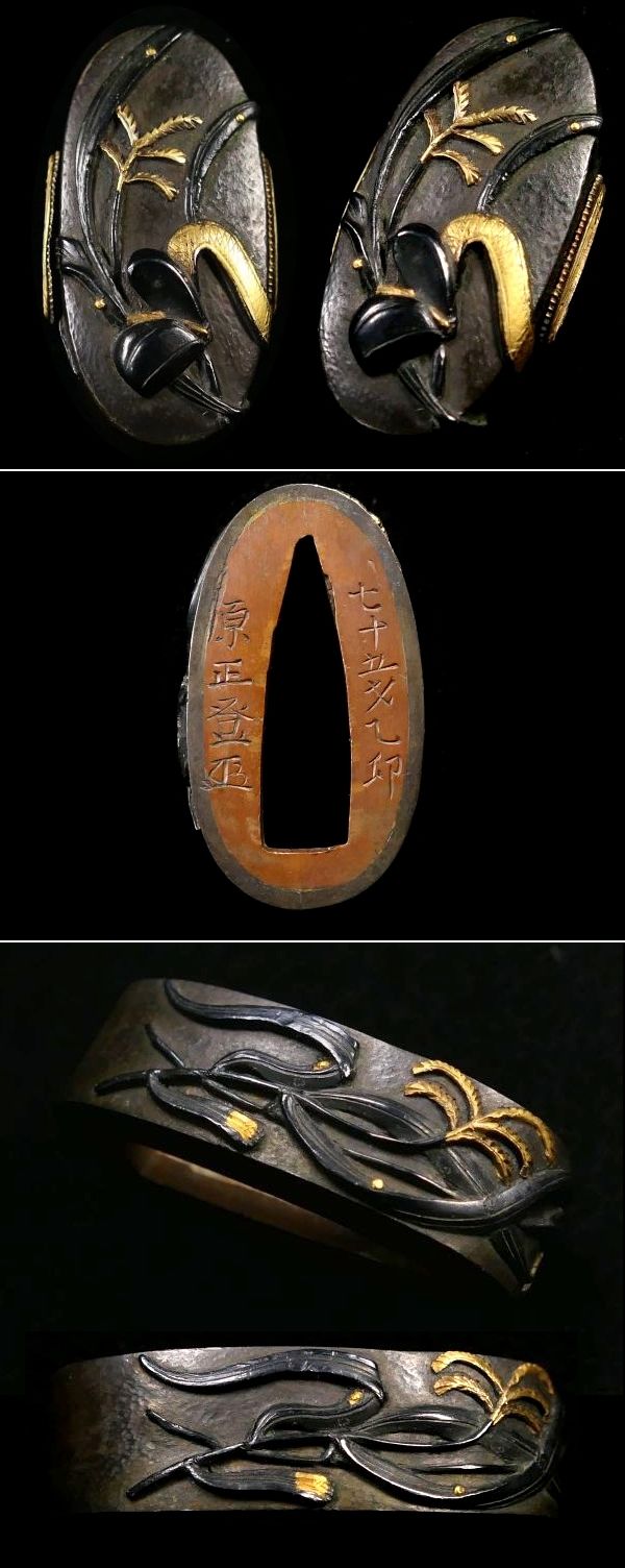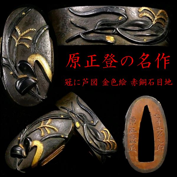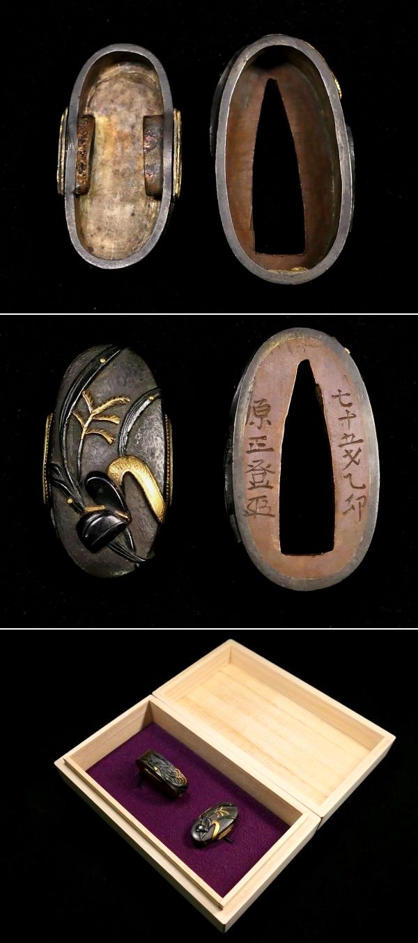 | 商品説明 | しっかりとした高彫り細工と 華やかな金色絵により 芦と冠の図が施された 「原正登 七十五才乙卯 」の名作縁頭です。 「原正登」の作品は現存数が極めて少なく 在銘品は特に希少とされております。 探してもなかなか出会う事は ないのではと思います。 冠が芦原に 打ち捨てられているかのような構図からは 侘寂(わびさび)の心が感じられるようです。 お好きな方、この機会に是非手に入れて下さい。 【しっかりとした高彫り細工】 【見栄え良き金色絵】 【侘寂(わびさび)の感じられる作品】 寸法: (縁) 約 3.73cm × 約 2.11cm × 約 1.08cm (厚み) (頭) 約 3.45cm × 約 1.57cm × 約 0.80cm (厚み) 時代: 江戸時代 材質: 赤銅地 桐箱付 銘 : 七十五才乙卯 原正登 花押 状態:特に気になる傷みはなく良好。画像にてご判断下さい。 :許容範囲内の時代傷みはご理解下さい。 |