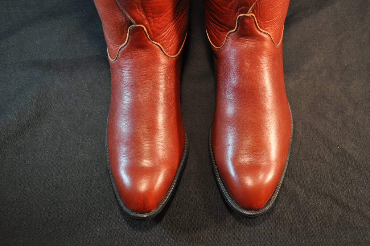 アメリカウエスタンブーツ会社トニーラマ社製 牛革 箱無 革底 アメリカ製 幅並 筒高30.5㎝ ヒール高3㎝ ノークレームノーリターンにてお願いします。ゆうパック100サイズ(送料金額及び発送方法についての交渉、希望指定はできかねます) 本物の価値の判る方で、USサイズご確認のうえご入札ください。以下の方は入札お断り 当方が判定:出品欄記載事項熟読しない方 日本語が正しく使えない方 日本の常識礼儀を理解しない方 状態に関して神経質な方 細かい交信確認をしないと心配な方 必要以上の情報の記載、要求をする方(特に業者) 以下の方は問答無用で落札者都合で削除:次点の落札者がいらっしゃる場合、落札後24時間以内に連絡無いまたは48時間以内にお支払い無い方。取引ナビ以外での取引を求める方。落札後に商品の質問交渉をする方(特に住所氏名を名乗らずにする)。初交信で連絡先を記載されない方。出品覧に明記してあるにも関わらず送料、合計金額の確認を求める方。評価の悪い方。評価欄に品位の無い文章で誹謗中傷を書いている方。その他常識礼儀に欠ける方 落札日近くの質問、及び愚問には回答いたしません。領収書の発行はしません。発送番号通知は致しません。(遅延事故の際はこの限りではありません。)
