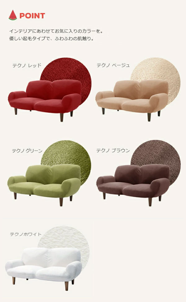 | ・背もたれ14段階リクライニング ・コンパクトながらしっかり二人座れるサイズ ・本物の木のような木目調の樹脂脚 ・ポケットコイル使用 ・安心の日本製 |