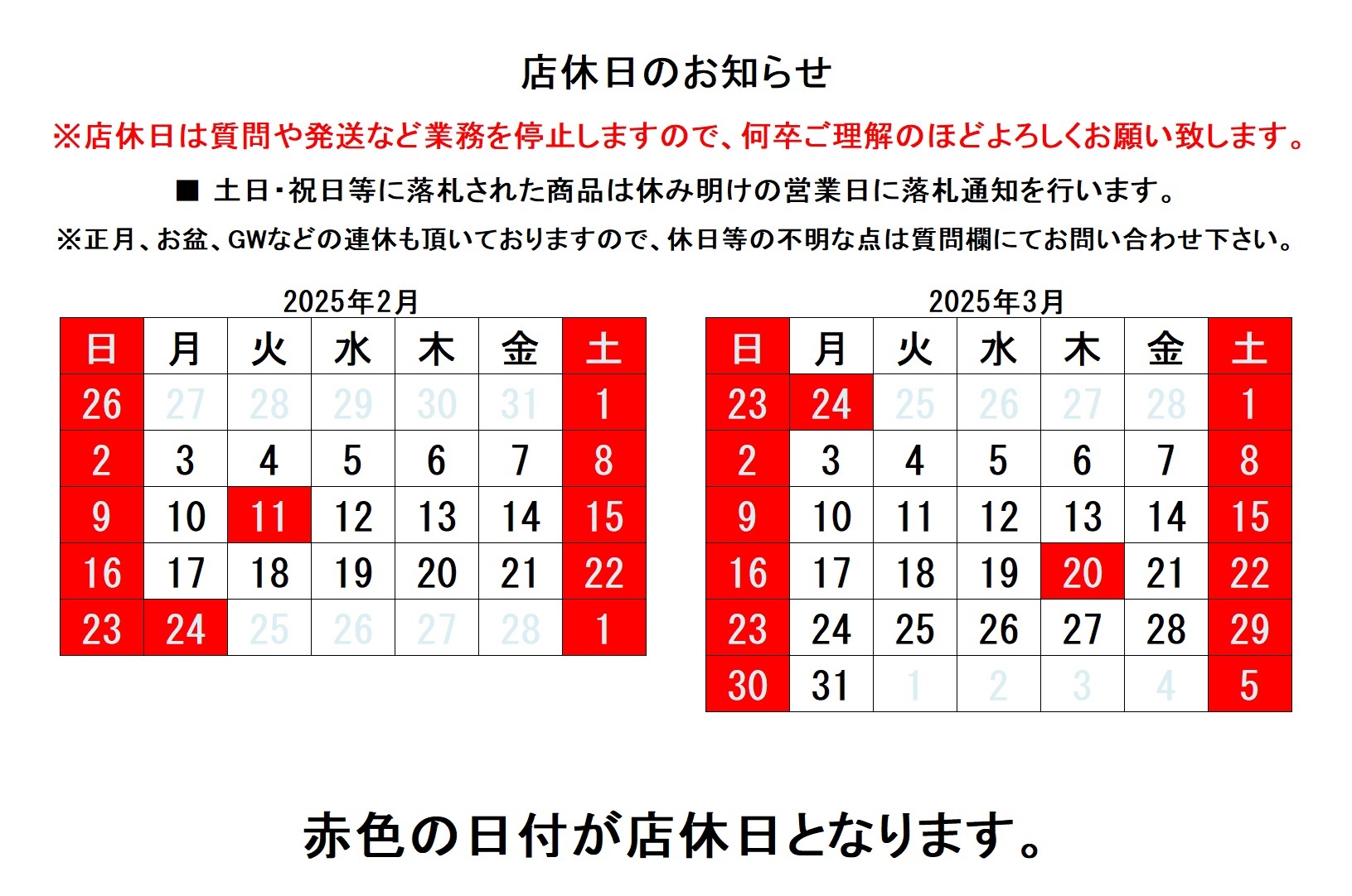 | 落札後のご注意 | ■ Yahoo!オークションより落札者様にはオークション終了後、落札通知が届きますので必ずご覧ください。 ■ 落札通知にお取引の詳細が記入されていますので確認後、メールでのご連絡をお待ちしております。 | ||