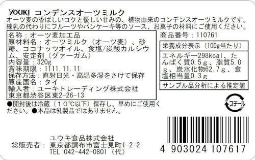 FlavorName:オーツミルク・内容量:320g・オーツ麦の香ばしいコクと優しい甘みの、植物由来のコンデンスオーツミルクです。・原産国:タイ・原材料:オーツミルク(オーツ麦)、砂糖、ココナッツオイル、食塩/炭酸カルシウム、安定剤(グァーガム)・商品サイズ(幅×奥行×高):75×75×82mm| お取引きについて【必ずご確認下さい】 | ||||||||||||||||||||