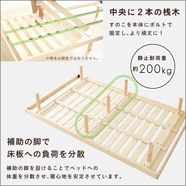 | 【ポイント】 3段階に高さを調節できる脚付きすのこベッド セミダブルサイズ! 北欧産パイン材はリフレッシュ、消臭、抗菌、防臭効果があります。 安心安全のF★★★★(フォースター)を獲得しました。 静止耐荷重は200kgと頑丈設計です。 通気性抜群で年中快適にお使い頂けます。 ベッドを並べてクイーンサイズ、キングサイズとしても利用可能です。 |