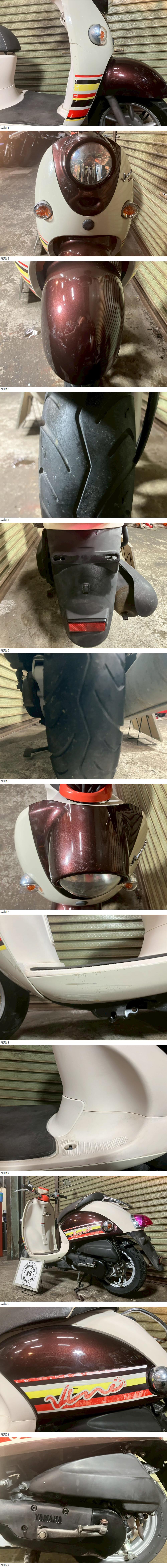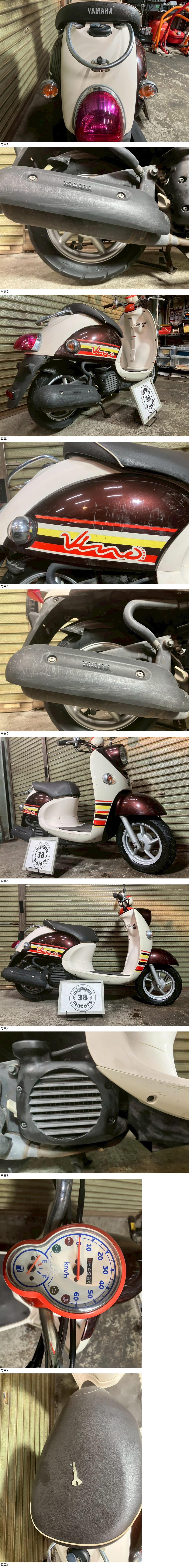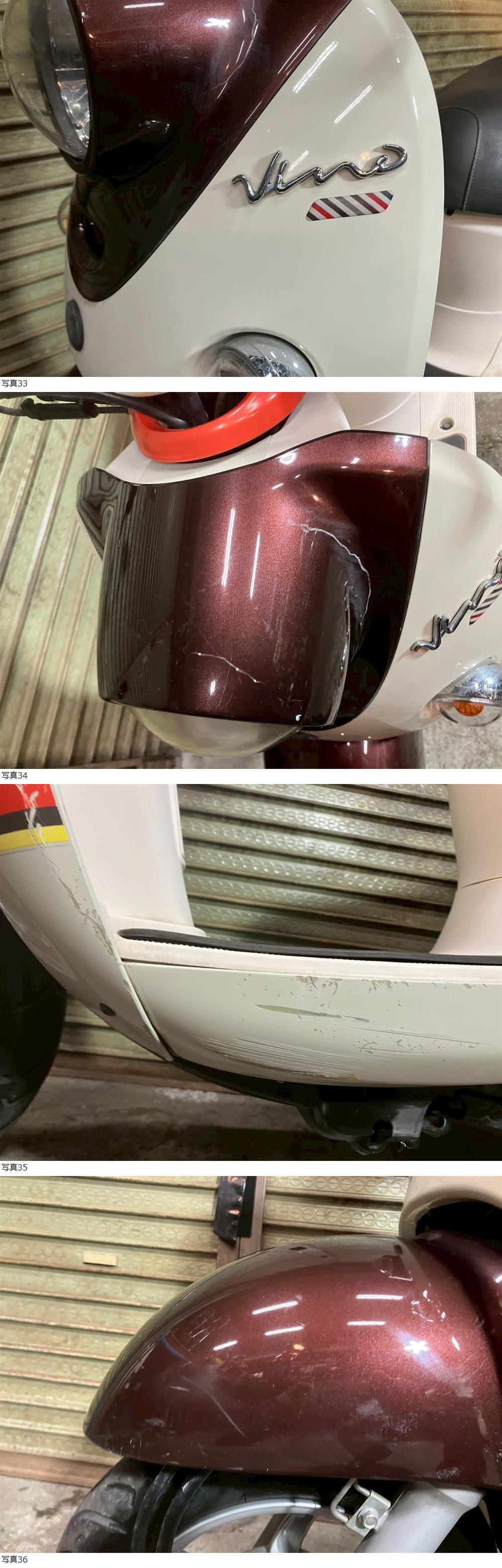 | 商品説明 | この度は当出品車両をご覧頂きまして誠に有難う御座います。 他にも複数台出品がございますので宜しければご覧ください! ご入札頂けた際には文末にありますお取引詳細にご同意頂けたものとさせて頂きます。 下記車両詳細・お取引詳細になりますので必ずご一読くださいませ! また、直接お越しいただいた方にその場で販売することもあるため予告なしに出品の取り消し等をする場合も御座います。 よって、落札前には一言コメント欄にてご一報頂けますと幸いです。予めご了承下さい。 〜〜車両詳細〜〜 メーカー:ヤマハ 車種:VINO 1オーナー 年式:2014年 色:ブラウン 鍵:純正キー1本 排気量:50cc 走行距離:5,496km 燃料供給装置:インジェクション フレームNo:SA37J-534XXX 自賠責:なし 自賠責の加入も可能です! * * * 低走行な1オーナーVINO入荷いたしました☆ ・外観 全体的に傷が多い為 状態は写真にてご確認ください。 ・エンジンセルにて始動O K! 吹け上がり良好! 確認箇所は以下となります。 スピードメーター:作動OK! ヘッドライト:ハイロー点灯! ウィンカー:前後左右点灯! テール:尾灯・ブレーキ共に点灯! ナンバー灯:点灯! ホーン:作動OK! ★別途部品交換受け付けます! ・タイヤ前後交換など!詳細は直接お問い合わせくださいませ! エンジンオイル・タイヤ交換など! 詳細は直接お問い合わせくださいませ! *上記ご利用の際は部品の在庫状況によりお引き渡しまでにお時間を頂戴する場合が御座います。 〜〜お取引詳細〜〜 ※ご注意ください※ 出品車両はあくまで現状販売となります。走行点検などは行っておりません。 良好・好印象などの表記に関しても車両の状態を確実に保証するものではなく 細かい程度の差なども含めあくまで当方の主観でありますこと重々ご承知置き下さい。 特別に気になる箇所など(外観に限ります)がある場合は直接ご相談ください。 ご指定いただきました箇所のお写真を添付をさせていただきます。 (あまりにも多い場合はご対応致しかねます。) 上記を踏まえまして現車の確認は大歓迎です。 細かい箇所など気になる方は是非とも現車確認を行ってください! (予約制となりますので直接お問い合わせください。) 一般の二輪販売店と同様の点検・整備は行っておりません。 車両に関する一切の保証等も御座いませんので自走でのお引き取りはお断り致します。 ある程度の知識があり落札後にご自身で整備の出来る方、或いは整備工場等にて分解整備を別途検討できる方、メンテナンスベースとしての使用などの落札を推奨しております。 明記してあること以外の確認はしておらず、また致しかねます。 目視できる消耗品以外のパーツに関しましても寿命のわからぬものなど御座います。 (中古品ですのでつい先程まで正常に作動していたにも関わらずお受け取りの際に状態の変化などある場合も十分御座います。例・電子機器、ワイヤー類など) 再三にはなりますが如何なる場合もお引き渡し後のキャンセル・クレームはお受け致しかねます。 現状販売というものを重々ご理解の上ノークレーム・ノーリターンでよろしくお願い致します。 原則キャンセルはお受け致しかねますが、止むを得ず落札者様都合でキャンセルされる場合には 落札金額の1割をキャンセル費用として頂戴させて頂きます。 上記取引内容に不安を感じられる方には二輪販売店等の整備・保証付き車両のご購入を強くお勧め致します。 ★直接引き取り・即引き取り大歓迎! 直接引き取りの場合、落札から1週間以内にお引き取り下さい。 それ以降日割りにて2,200円を別途頂戴させて頂きます。 *部品交換をご依頼の方は完成のご連絡から1週間以内となります。 ★配送OK! 主に配送業者に委託しております。ご自身で手配いただいても結構です。 レッドラインの金額を参考にしておりますのでお手数ですが費用に関しましては落札者様にて直接HPでご確認下さい。 発送元は埼玉県川口市となります。ご購入から配送までの目安は関東近郊で1〜2週間程度となるかと思います。(地域、期間により大幅に異なりますので納期が気になる方は直接レッドラインへお問い合わせ下さい。) 関東近郊の場合割増でお早めにお届けできる場合も御座いますので一度ご相談下さいませ!(対象外となる場合も御座います。) また、配送の場合もお取置き等の対応は致しかねますので落札後は速やかに配送依頼の手続きを行わせて頂きます。 ★車両のみの販売となりますので必要な場合のみ別途5,500円にて販売証明書の発行・発送を受け賜ります! ★新規アカウントの方、落札者様の評価内容によりましては、ご入札頂いても当方の判断で削除する場合がございます。予めご了承下さい。 ★落札後、24時間以内にお客様情報のご入力・落札代金のお支払いがいただけない方のお取引はキャンセルとさせていただきます。(お支払いに関しましては、どうしてもの場合大幅な期間でなければある程度ご相談にのらせていただきます。) 予めご了承くださいま