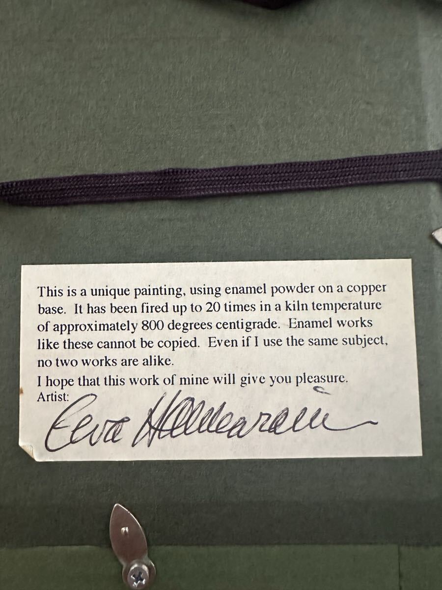 フィンランドの画家エバ・ハッカライネンの作品青のパンジーです、銅板にエナメルで絵を描き焼き入れしています、額サイズ約34.5x 30cm, 作品サイズは、約14.5x10cm他詳しくは、わかりませんが、画像の通りです、長期間保管品 古い品に、なりますので、ノークレーム、ノーリターンで、お願いします、