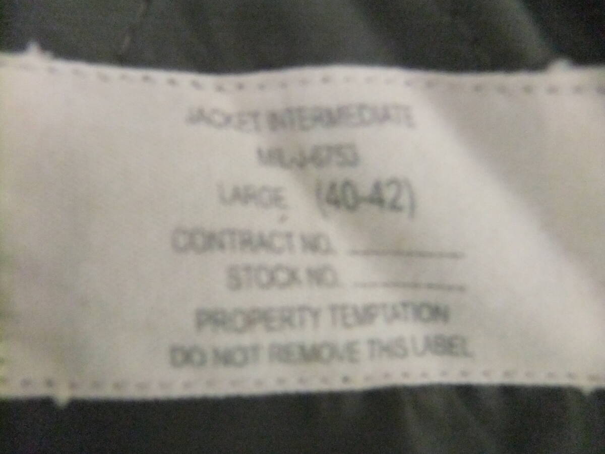 ジャケットです。タグに JACKET INTERMEDIATE MIL-J-6753 LARGE(40-42)とあります。特に大きなダメージはありませんが。中古のため使用感はあります。送料のご負担とノンクレーム・ノーリターンでお願いします。