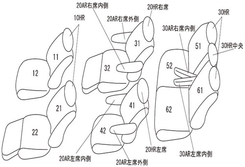 | シートパターン | ヘッドレスト総数:7 1列目肘掛:0 2列目肘掛:4 3列目肘掛:2 サイドエアバッグ:○ |
