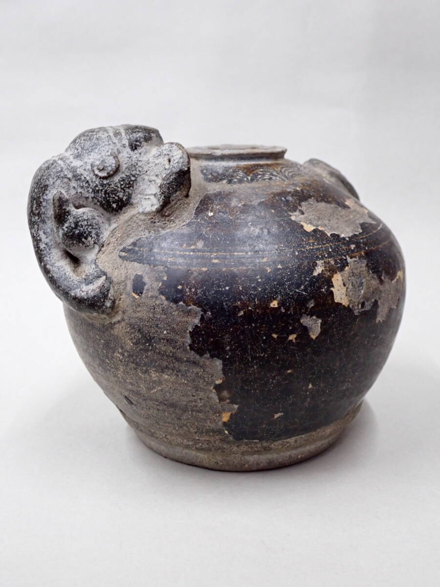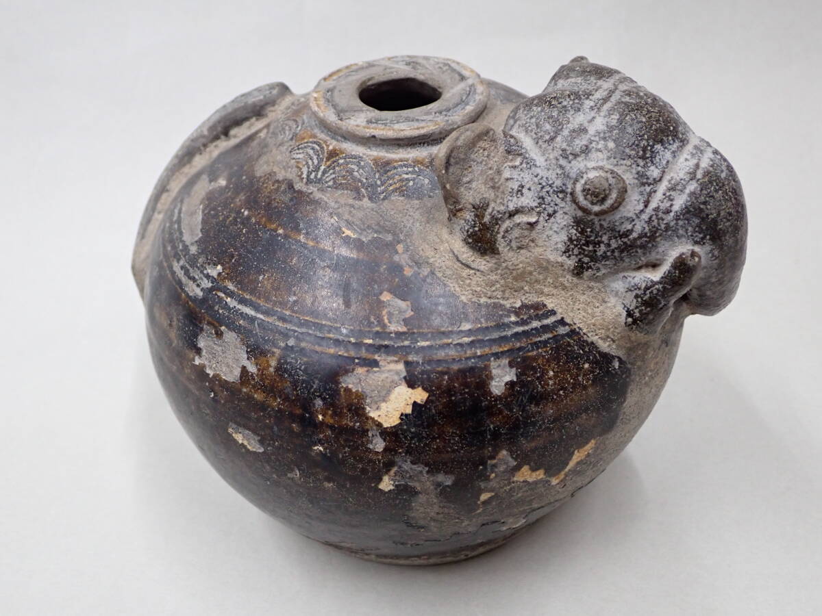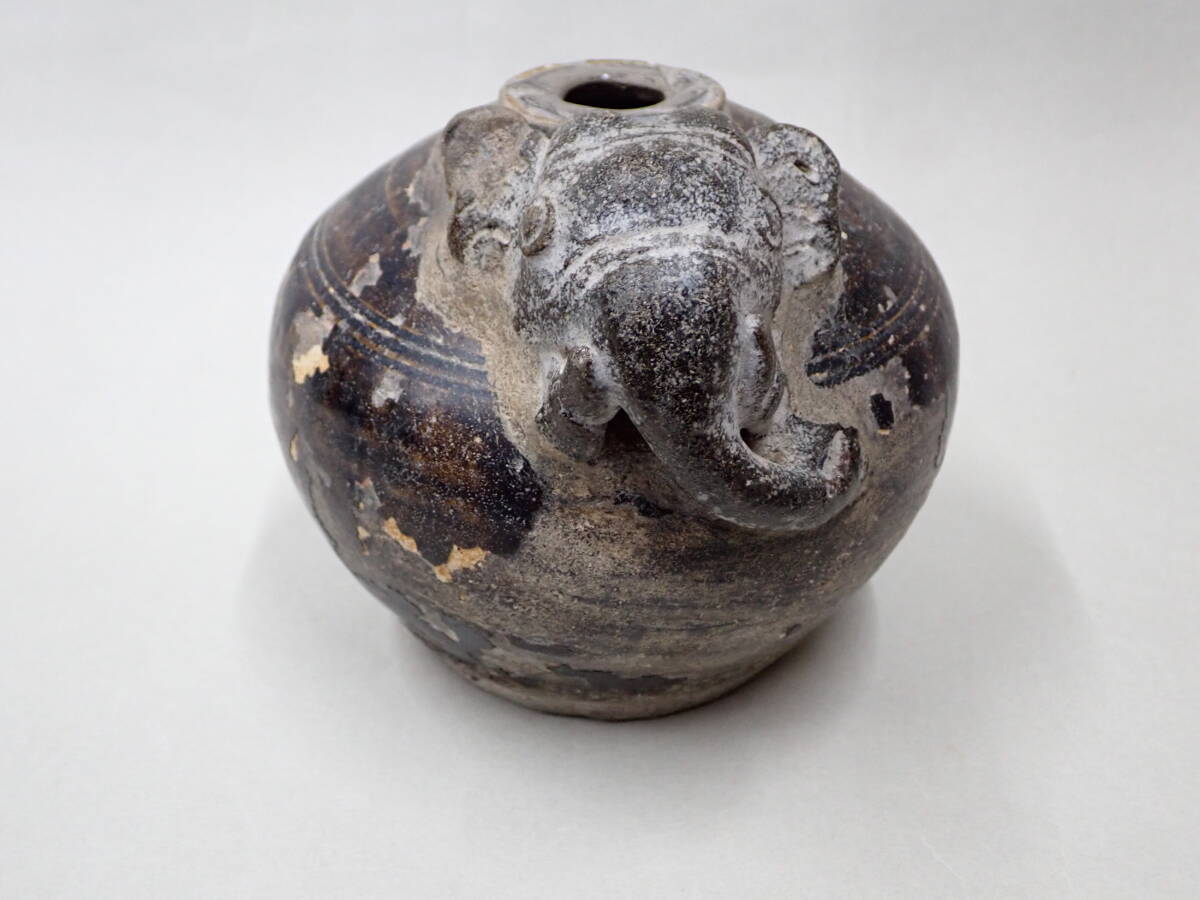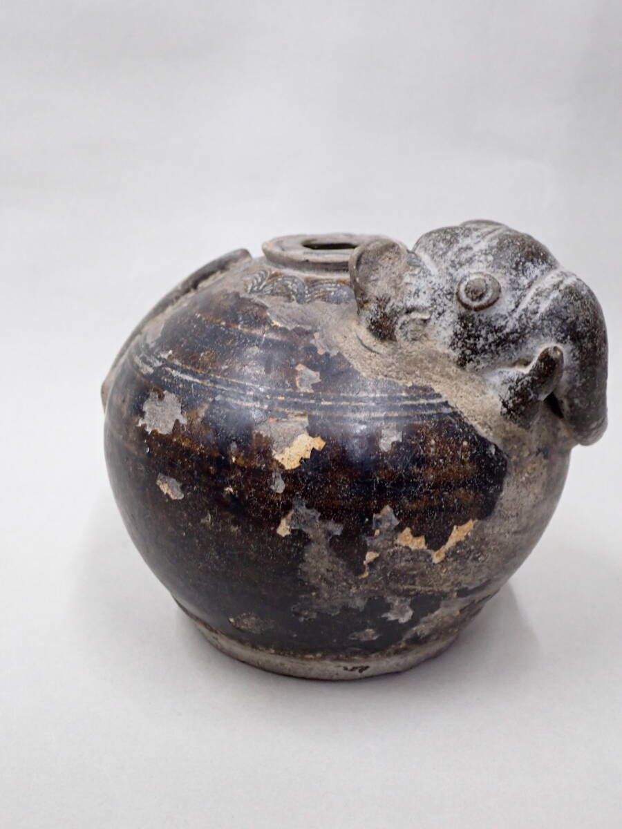 14~15世紀タイの象形壺です。クメールに原点を持つ独特の象形の壷です。象壺は現地でも人気があり高価です。大きさのあるものは中々見つかりません。釉の剥落が部分的に見られますが、全体の形もよく残りこれといった大きな傷もない優品です。
