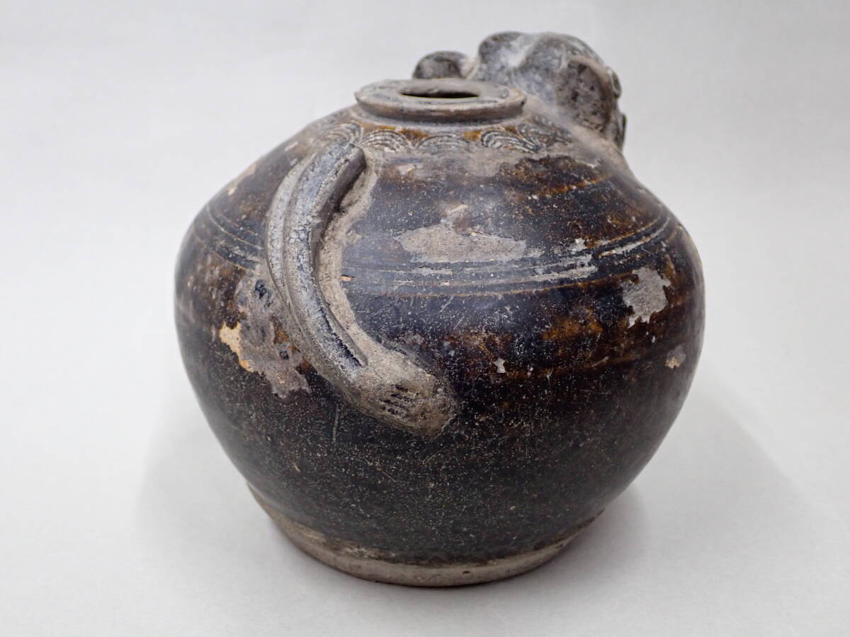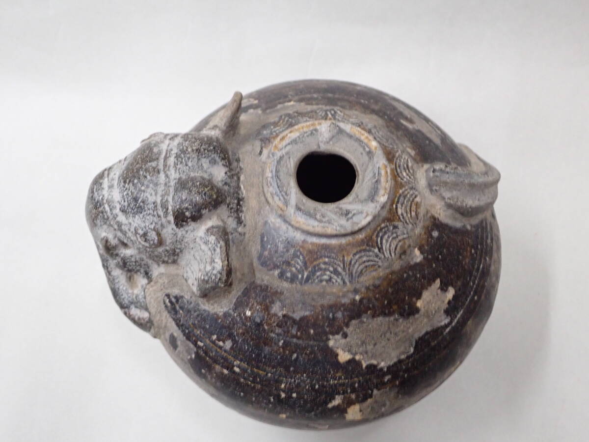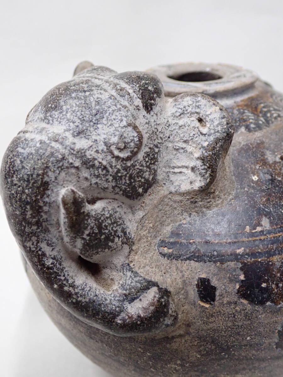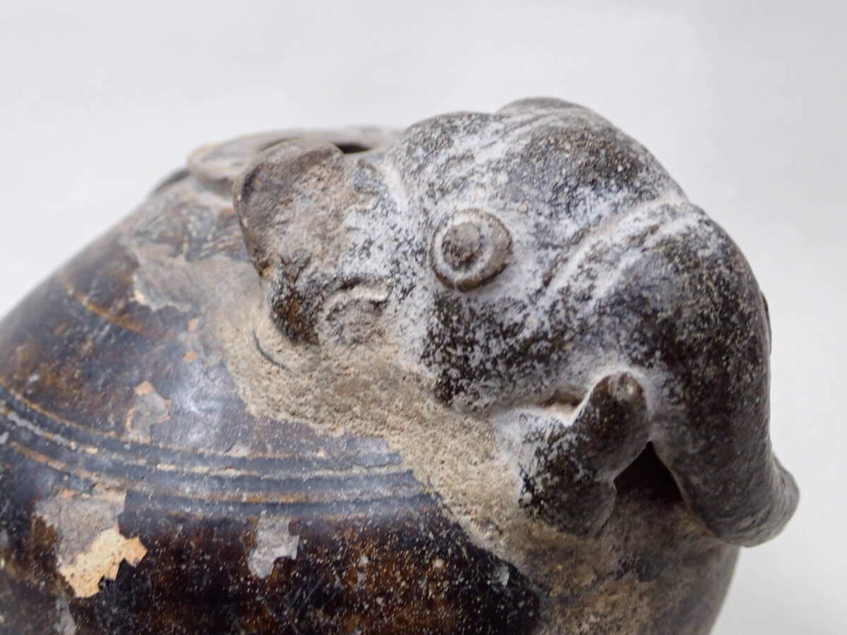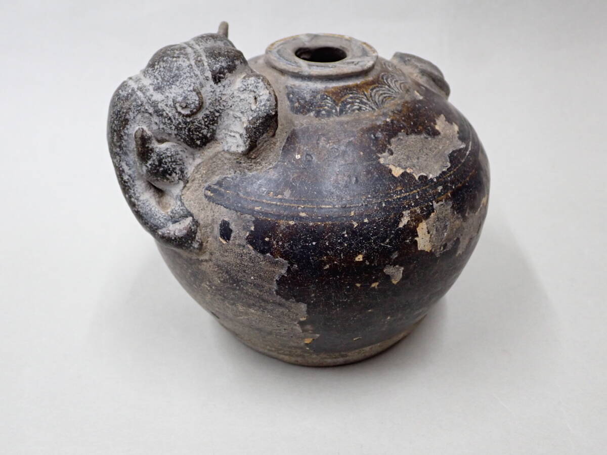 14~15世紀タイの象形壺です。クメールに原点を持つ独特の象形の壷です。象壺は現地でも人気があり高価です。大きさのあるものは中々見つかりません。釉の剥落が部分的に見られますが、全体の形もよく残りこれといった大きな傷もない優品です。