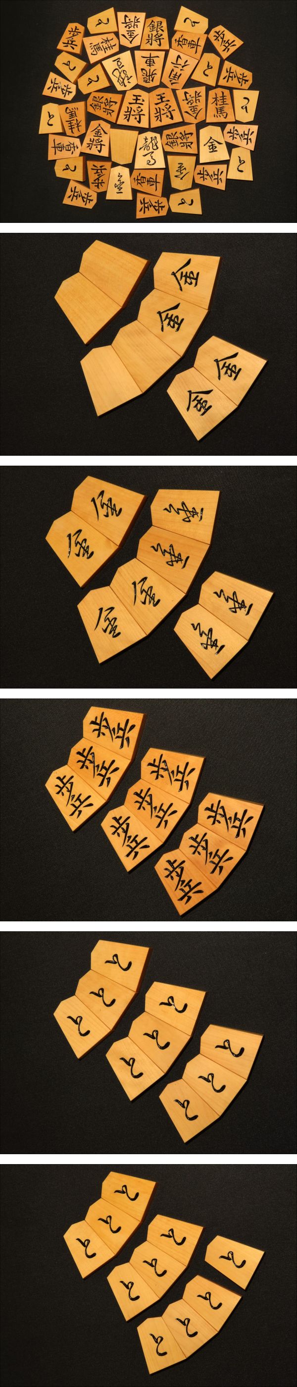 木地は御蔵島黄楊、赤柾とまでは行きませんが上柾目の味の良い木地です。赤柾まであと一歩という意味で「赤系柾目」と謳わせていただきました(木地が「赤い」という意味ではありません)。全ての駒の表裏をUPいたしましたので是非ご覧ください(木地種表記は私見です、写真でご確認をお願い致します)。