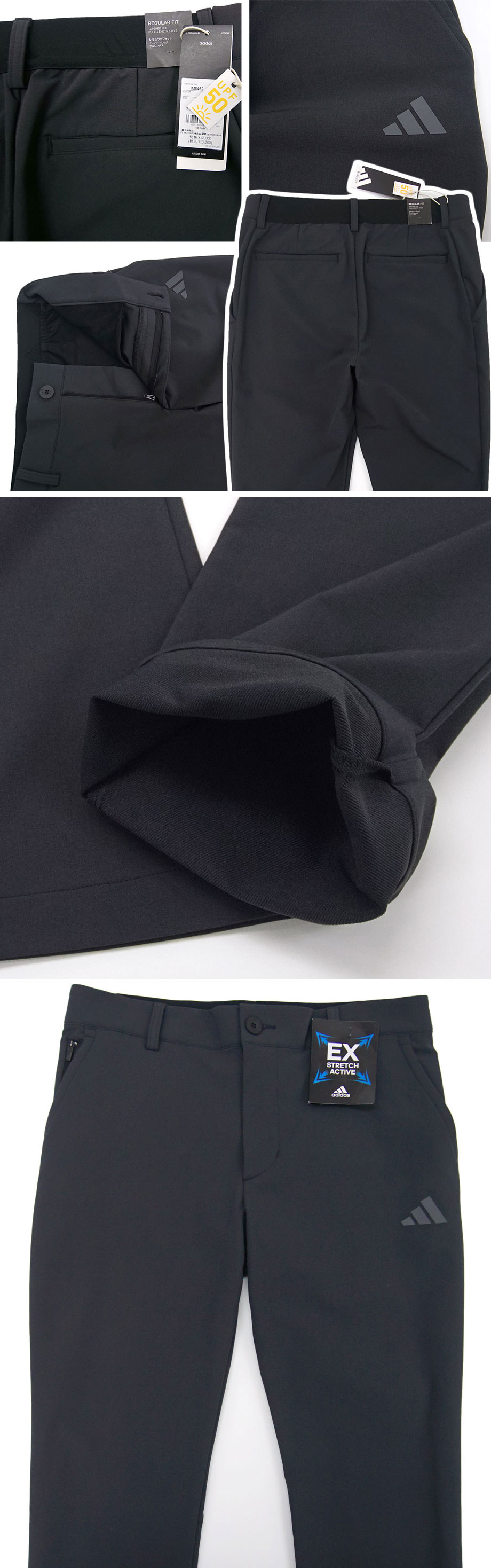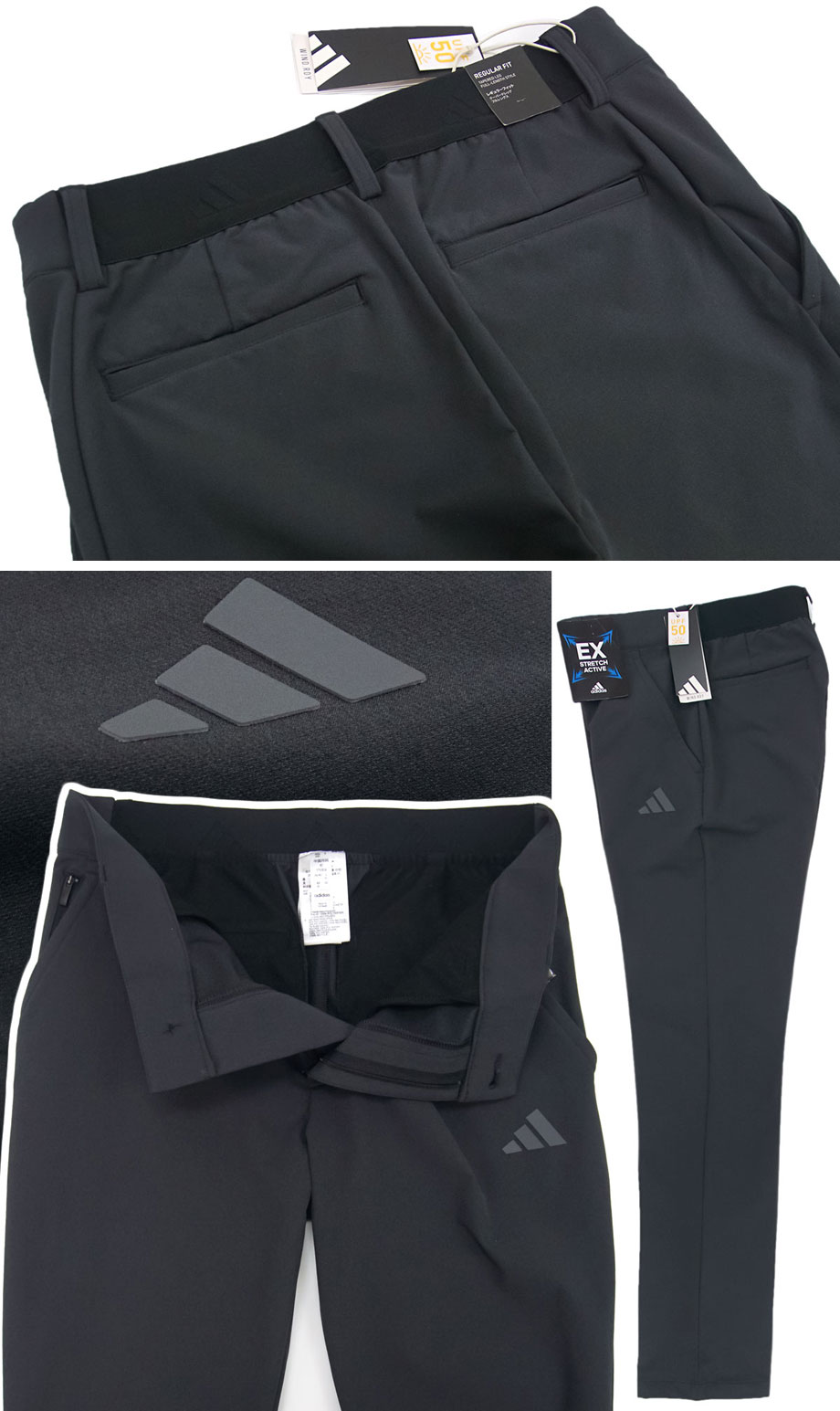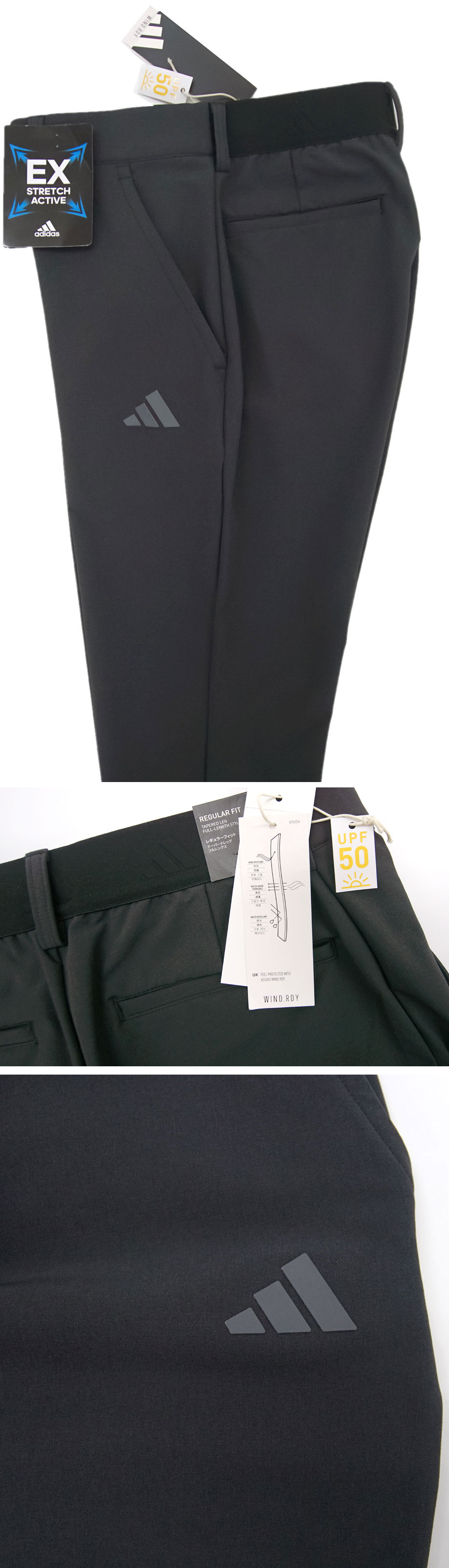 国内正規品(アディダスジャパン株式会社)。どんな動きにも滑らかにフィットする「EXストレッチ(スーパーストレッチ)」生地を採用し、動きをさまたげない抜群の伸縮性が魅力。ウエストもゴム入りで約8cm伸縮し快適な穿き心地。すっきりとしたテーパードシルエット。フルレングス。相反する「撥水・透湿」に加え「防風」も実現した高機能【WIND. RDYテクノロジー】。透湿性があるため内側のムレは排出しつつ、撥水性もあり外からの雨などははじきます。秋冬~春まで季節をあまり気にせず、長いシーズンご活用いただける使い勝手の良い品です。強力なUVカット性能(UPF 50+)も有しており、紫外線による皮膚へのダメージを軽減します。ゴルフラインの高機能パンツですがベーシックかつシンプルなデザインでカジュアルやビジネスカジュアルにもご活用いただけるのが、おすすめのポイント。ご家庭の洗濯機でお気軽に洗濯ができます。定価は税込13,200円の品。希少な大きいサイズ(キングサイズ)「ウエスト 100cm」の出品です。どうぞお見逃し無く。(並行輸入品ではなく、国内の大手スポーツショップや百貨店等で販売される国内正規品となります)