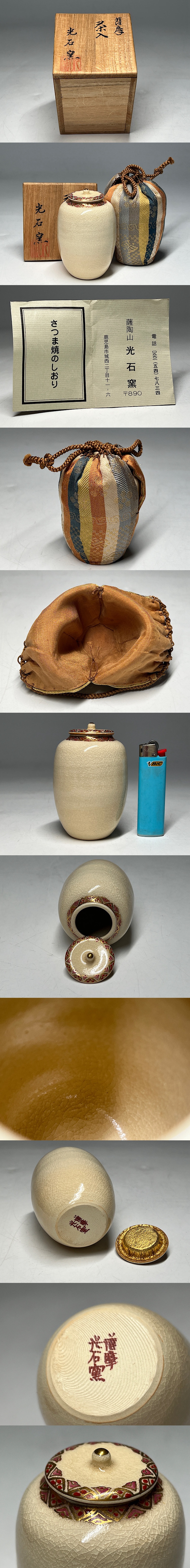 薩陶山 光石窯 薩摩焼 茶入れ 仕覆付き 共箱 栞 ◆商品詳細 寸法(約):8.8x6x2.7(高×幅×口径cm) ※寸法に若干の誤差が生じる場合もございます。 少し汚れ、箱の蓋裏に接着剤の跡がありますので、 ご承知の上入札お願いします。 状態等画像にてご確認の上ご入札よろしくお願いいたします。 ◆発送先等のご連絡とお支払いについて ※発送先等のご連絡 落札時から48時間以内にお願い致します。 ※お支払 かんたん決済の期限内にお願い致します。 複数点落札時にまとめて取引の場合(72時間内)に、 まとめて取引の取引手順(落札者方の操作)を参考にお願い致します。 梱包したサイズを測って、地方によって送料を決めますので、よろしくお願いします。 ◆掲載画像について ※画像は現物を撮影しておりますが、照度、遮光、モニターによっては実物と 色目が異なって見えることがありますのでご注意ください。掲載画像では確認 できない傷や汚れがある可能性もございます、あくまで 中古品であるということをご承知の上、御入札をお願い致します。 ◆補償について 商品到着後はすぐに状態の確認をお願い致します。 商品の破損等がございまし たら、箱や梱包材など全てそのままの状態で保存し、お早めにご連絡ください。 (到着日から一週間以上経過、梱包材の廃棄済み等の場合、保証は致しかねます のでご注意ください。) ◆返品について 思っていたイメージと違う、などのお客様主観による返品はお受けできません ので、予めご了承ください。ノークレーム、ノーリターンでお願いします。届 いた商品が商品説明と著しく異なる場合(寸法、キズ記載ミスなど)のみ承り ます。早めにご連絡ください。 ◆注意事項 当方の希望価格と隔たりがある場合は、終了前にやむなく取下げさせて頂く場 合がございます。 ※商品ご落札翌日から4日間以内にご連絡が取れない場合は、入札取消の処置を 取らさせていただく場合がございます。 ※評価の悪い方は取り消す場合がございます。 ※原則として当方の不備以外のキャンセル・返品・返金は受け付けておりません。 以上の点を予めご了承頂いた上で、入札・落札お願い致します。 ◆発送方法 ▼ゆうパック(補償あり/追跡あり) 梱包後のサイズ:~約60cm ※送料全国一律880円 (但し北海道、沖縄、離島は+500円いただきます。) 発送元は静岡県となります。 ( 商品の組み合わせによっては同梱をお断りさせていただく場合があります。) ※大型商品について 郵便局の規定を超える商品の場合は、佐川急便またはヤマトでの発送となります。 |