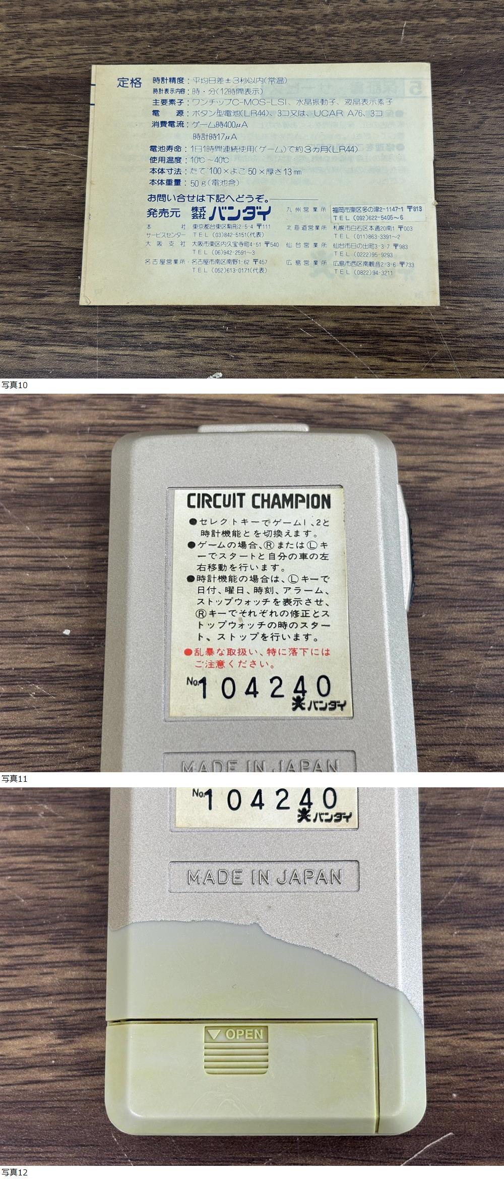 出品の商品は 21888★BANDAI ELECTRONICS バンダイ エレクトロニクス LCD GAME DIGITAL ゲームウォッチ サーキットチャンピオン 16179 ゲーム機 当時物 になります。 出品詳細を最後まで読んで頂き、入札をご検討下さい。 ・画像で詳細・状態をご確認ください。 ・頂き物です。 ・長期間自宅保管品です。 ・元箱、説明書、本体に経年による傷みがあります。 ・ゲーム機本体の電池を入れるところがサビています。 ・傷や汚れがあります。 ・電池を交換したところ、音は出ますが映像が映りません。 ※音も正常に鳴っているのか不明です。 ・正常に遊べるか保証は出来ません。 ・ジャンク品としてのお渡しになります。 ・ご理解頂ける方のみご入札をお願いいたします。 ・ご確認したい点があれば、質問よりご連絡ください。 専門知識が必要なご質問にはお答え出来ない事もありますが、可能な限りご返答させて頂きます。 ・画像が全てとなりますので掲載画像をご覧の上ご判断頂きご入札をお願い致します。 | ||||