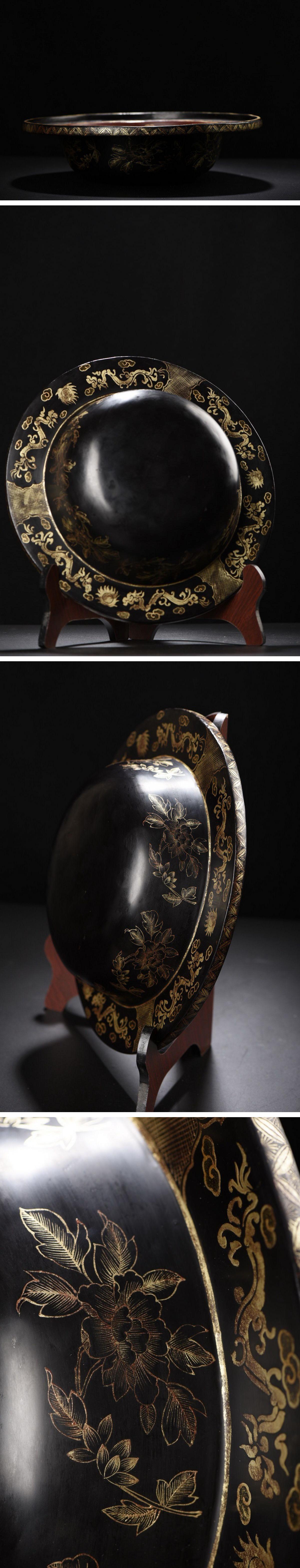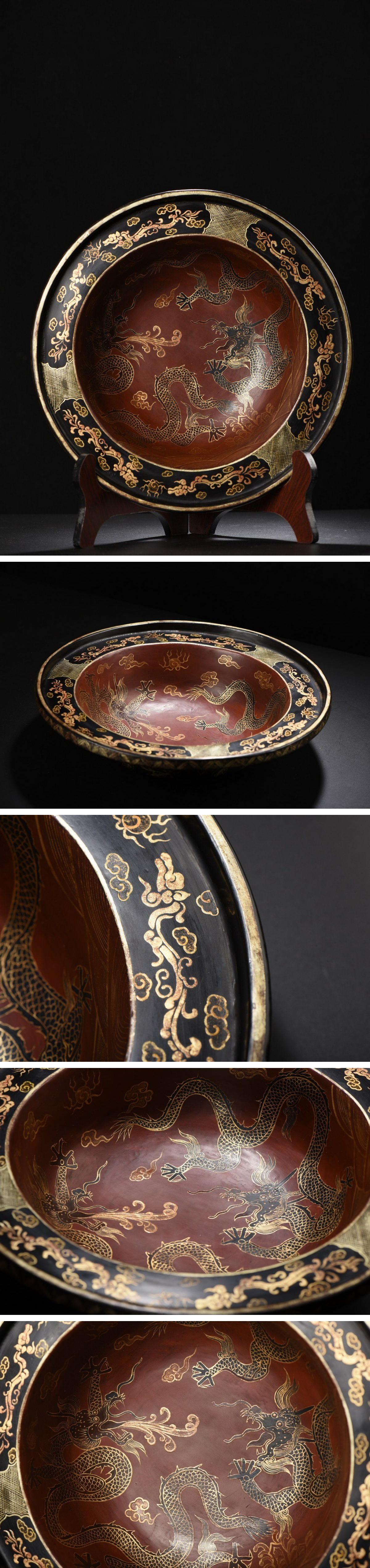 【雲錦】1円から 清時代 木胎雲龍文金蒔絵 寛耳盆 材質保証 時代物保証 古美術 骨董品8L21-13S8