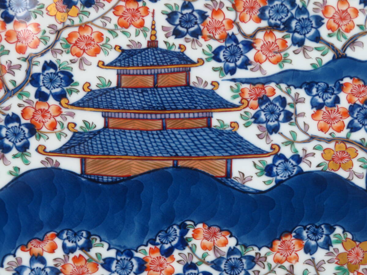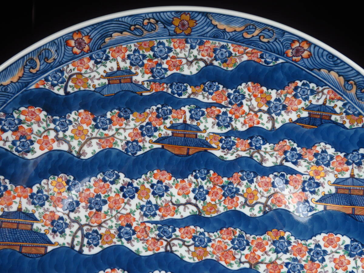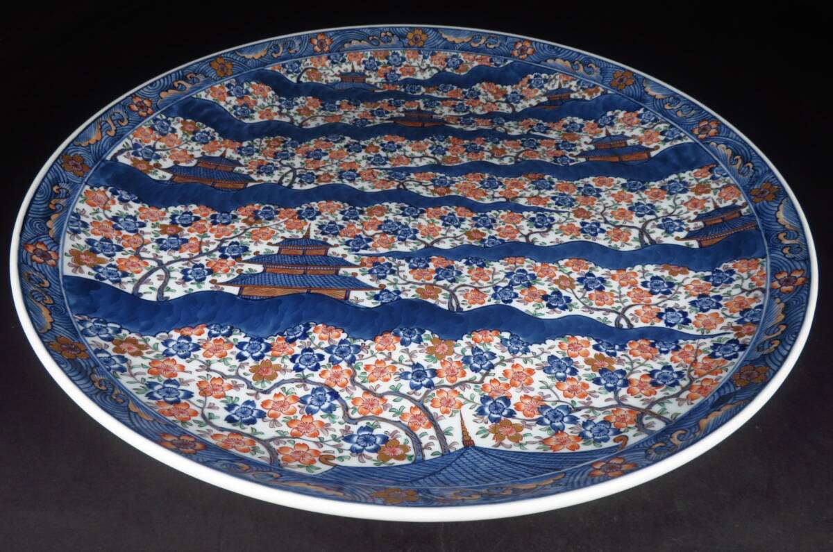 | 【SAKURAYA】秀逸作品【染錦 古伊万里楼閣桜図大皿/有田焼 館林源右衛門】飾皿 細密絵付 作家 在銘 共箱 骨董品 古美術品 直径46cm | ||