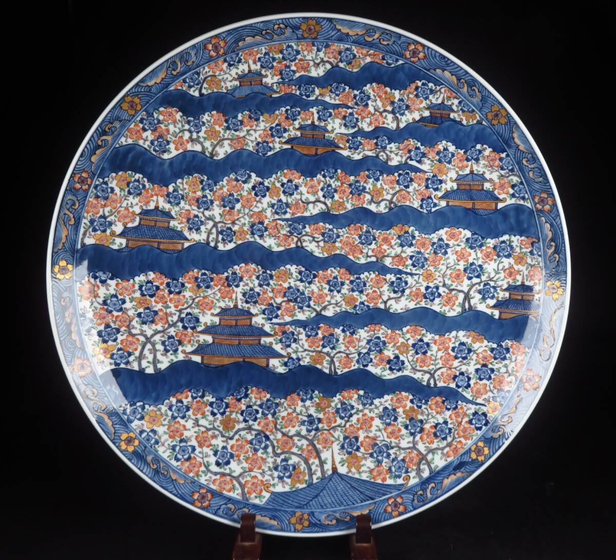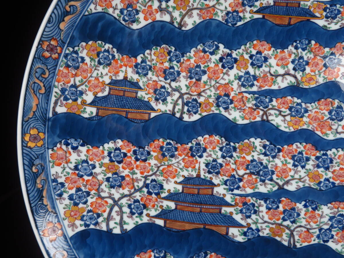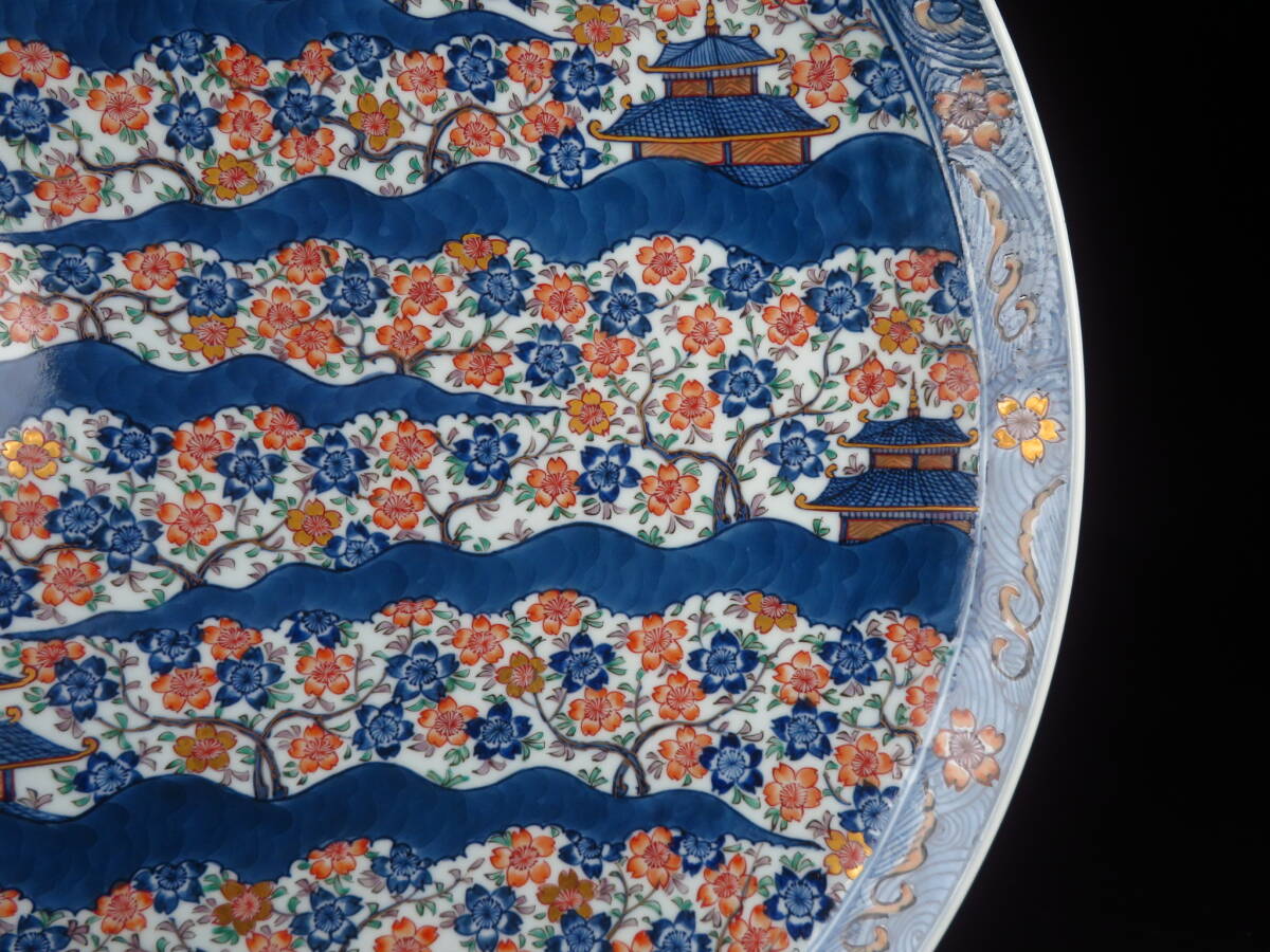 | 【SAKURAYA】秀逸作品【染錦 古伊万里楼閣桜図大皿/有田焼 館林源右衛門】飾皿 細密絵付 作家 在銘 共箱 骨董品 古美術品 直径46cm | ||