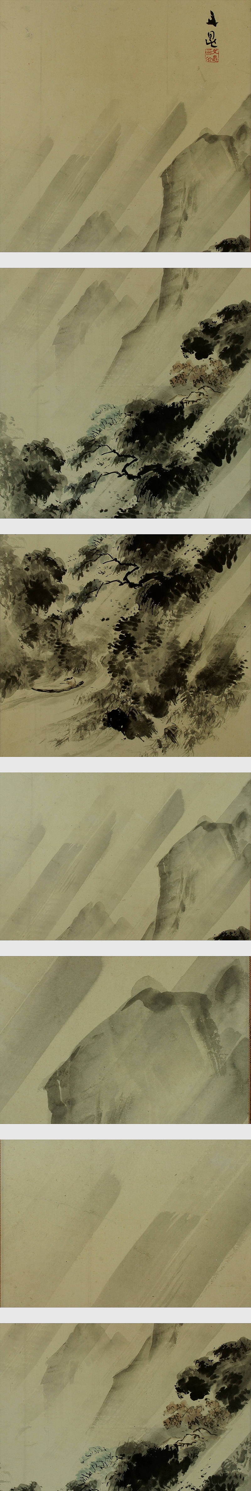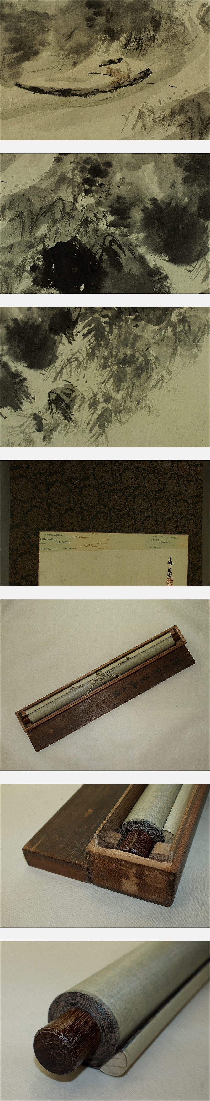谷文晁 たに-ぶんちょう(1763-1841) 江戸時代後期の画家。 宝暦13年9月9日生まれ。谷麓谷の長男。加藤文麗,渡辺玄対らに師事。 狩野派,土佐派,南宗画,北宗画,西洋画などの手法を取り入れて独自の画風を創出, 江戸文人画壇の重鎮となる。田安徳川家に仕え,松平定信編「集古十種」の挿絵も描く。 渡辺崋山ら門人多数。天保11年12月14日死去。78歳。江戸出身。 通称は文五郎。別号に写山楼,画学斎など。 本紙は、染み痕、擦れ、虫食い痕があります。 表装は、改装済みの為きれいです。箱に傷みがあります。 【サイズ】 作品 横約53cm×縦約123cm 表装 横約67cm×縦約189cm |